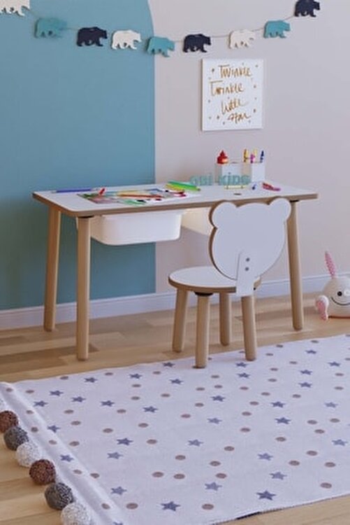 Activity Desk with 2 Baskets 1 Piece Backrest Chair. *** Table and Chair are rounded corner/edges. The product does not have a sharp edge that can harm the child. **Table has a Sumber-Delete surface. It is bright white. * Drawers are rail, open and close. More durable and ergonomic backrest is available with special chair attachment bracket. The table surface is bright white. Write-Delete feature. Product legs are made of hornbeam wood. Abrasive. The foot attachment is specially manufactured and made of durable plastic. Provides longer life and durability. The backrest of the chair is connected to the seat by the attachment apparatus. Thanks to the ergonomically designed fastening bracket, the chairs are more robust, more comfortable. Improvements were made in the product taking into account the moving nature of the children, materials were strengthened or added. Table Dimensions: Height 50 cm Width: 90 cm Depth: 45 cm. Stool Dimensions: Seat Height: 28 cm Seat Width: 30 cm Material: 1 Grade Glossy White MDF.