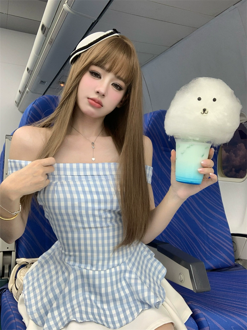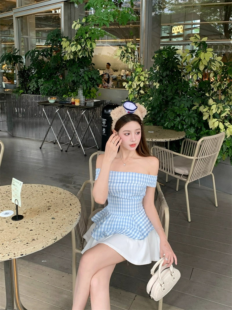 Off-shoulder bateau collar plaid short sleeves slim fit embroidery