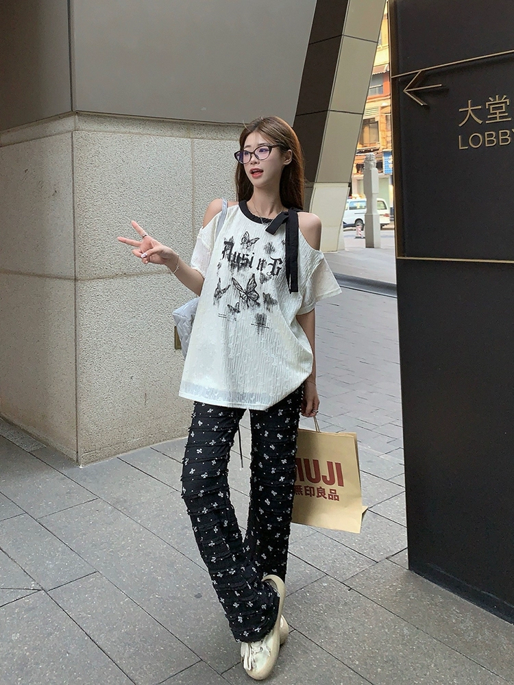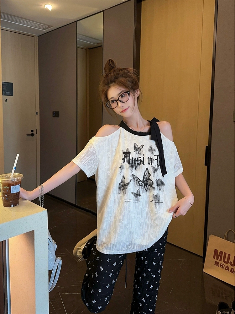| nameOriginal | Off-shoulder butterfly print black women's summer short-sleeved T-shirt |