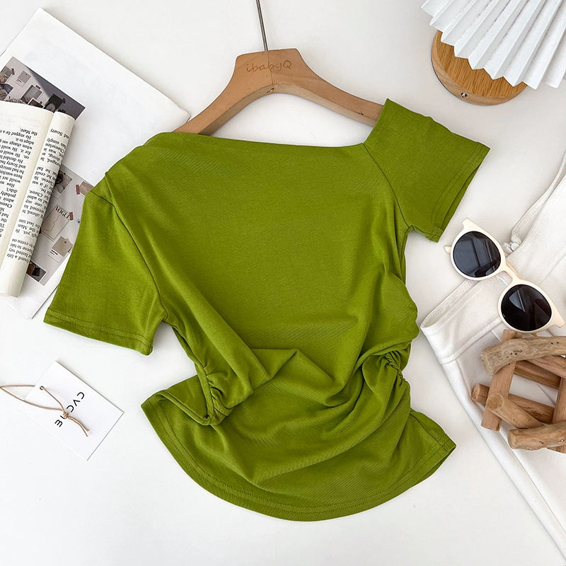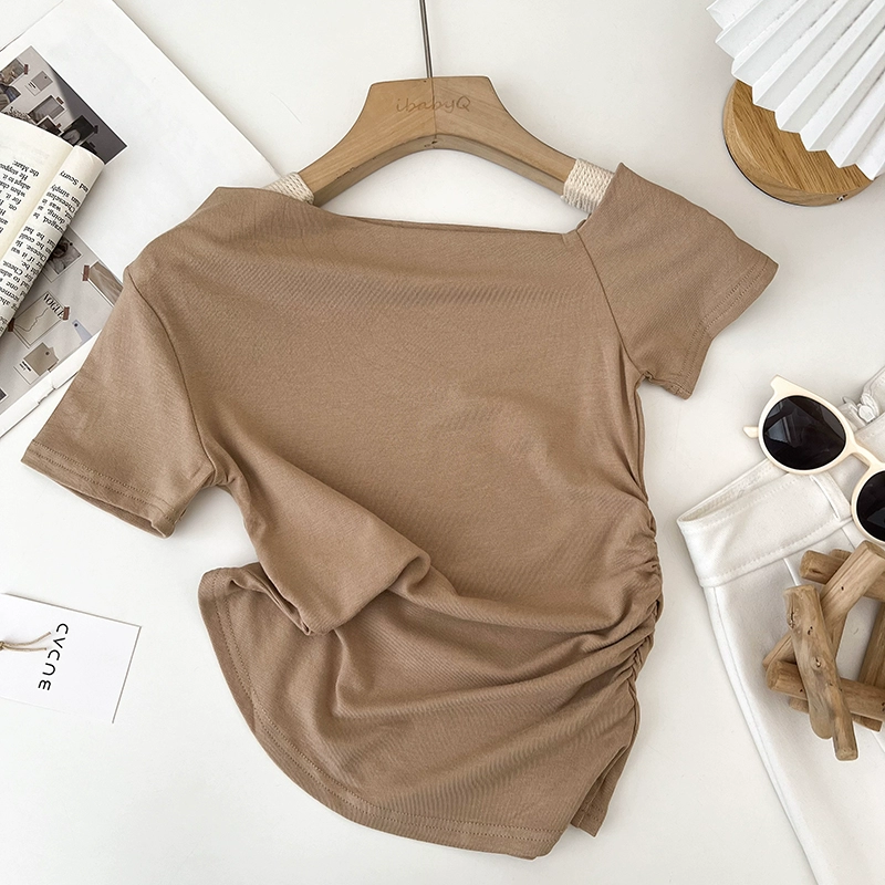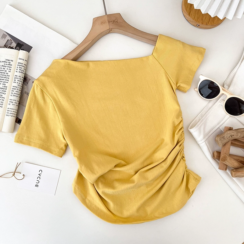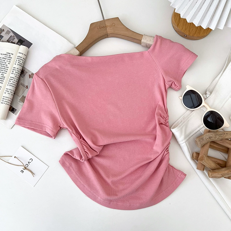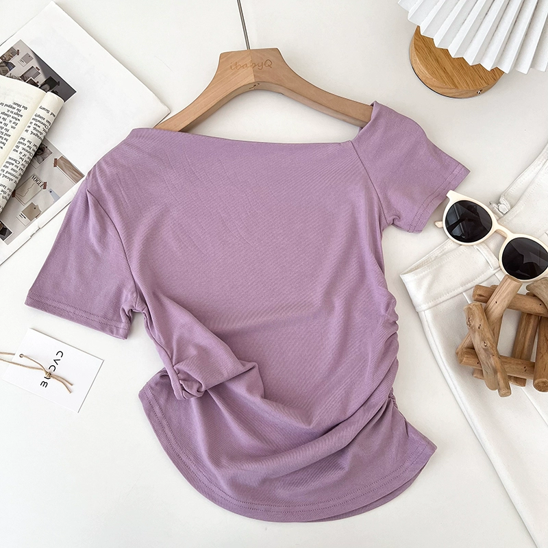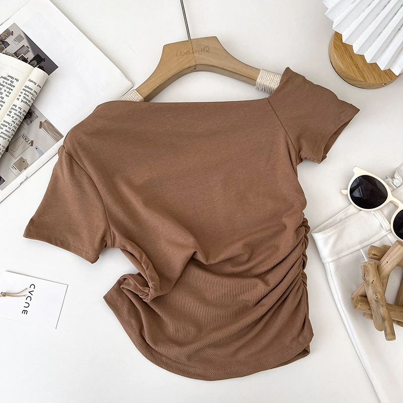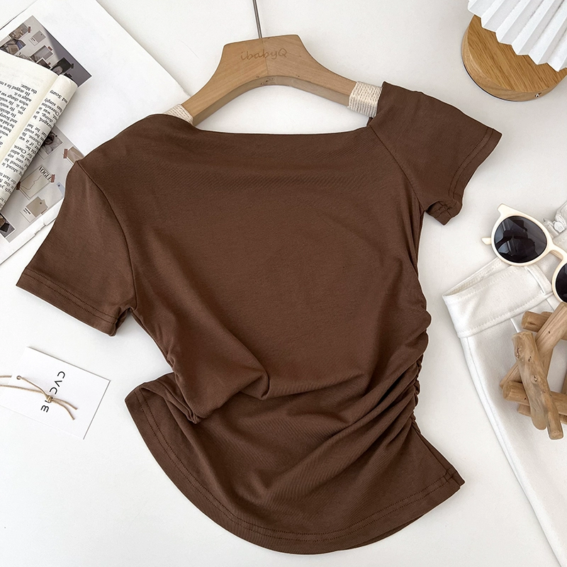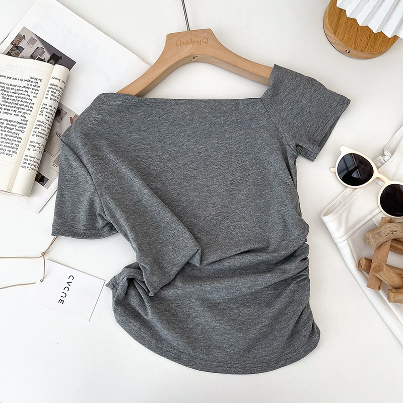 Off-shoulder design fashionable pleated slim-fitting top t-shirt