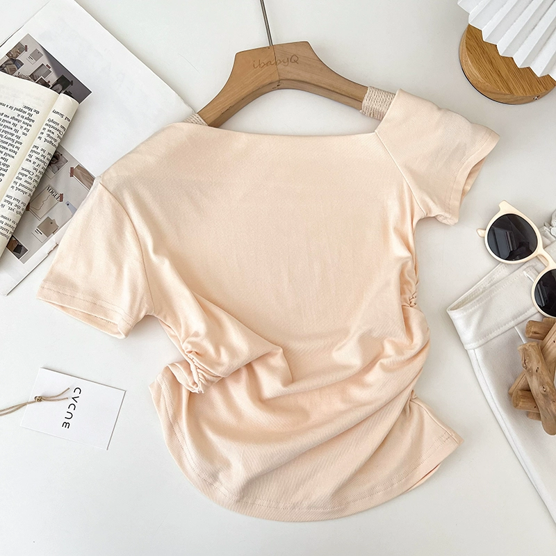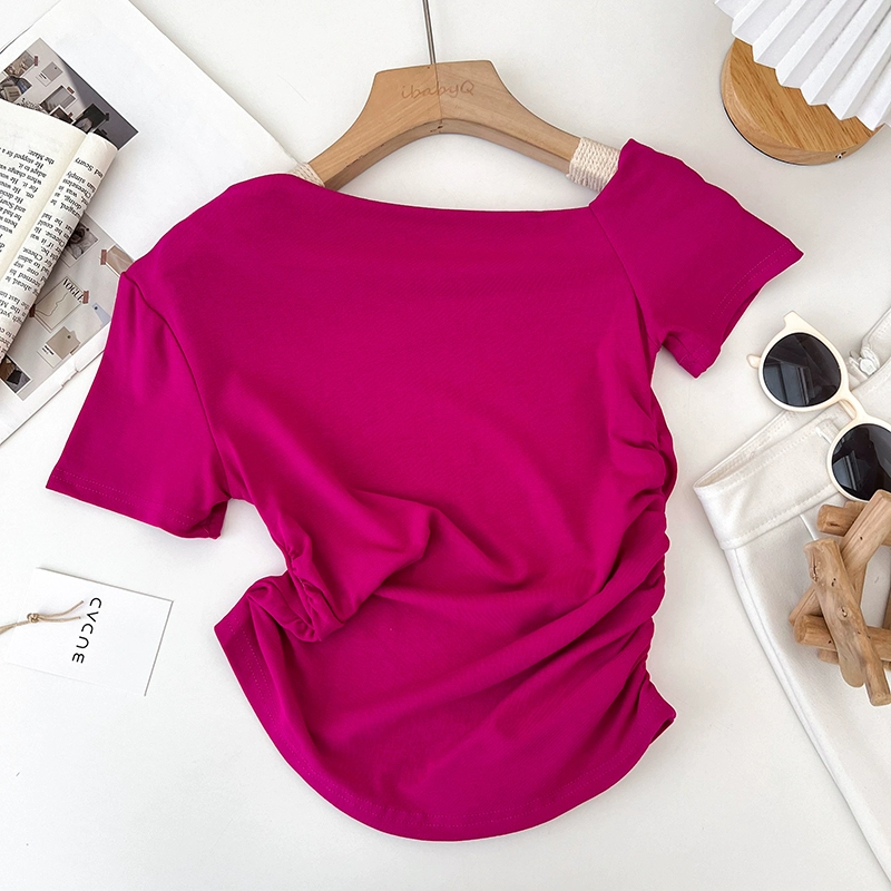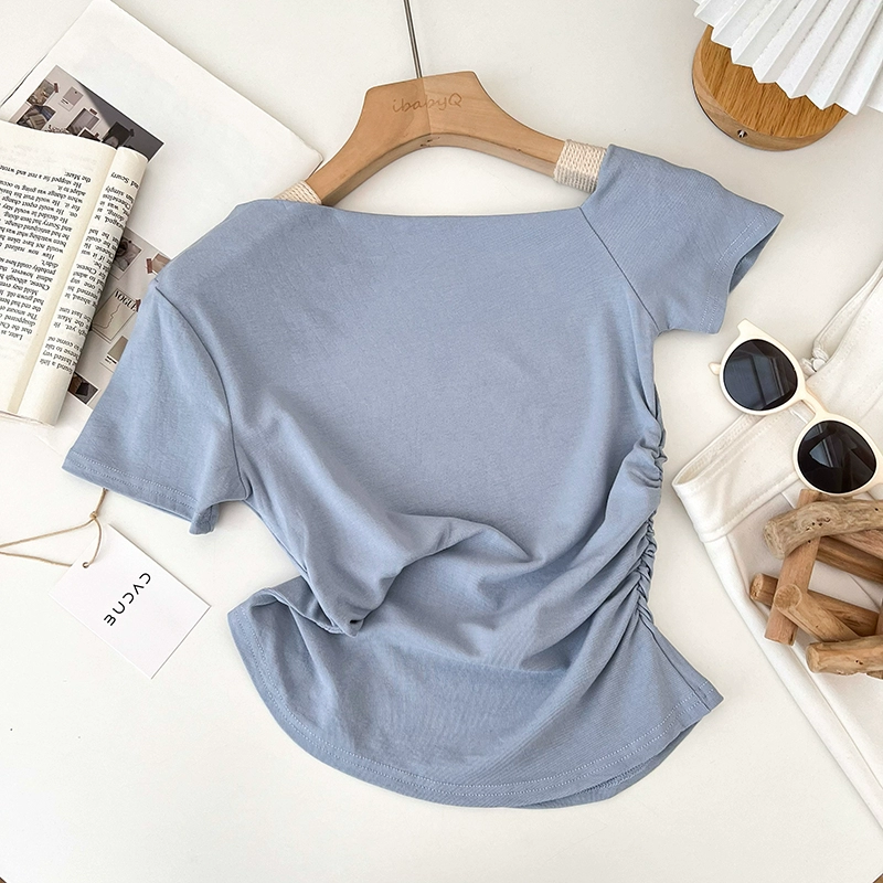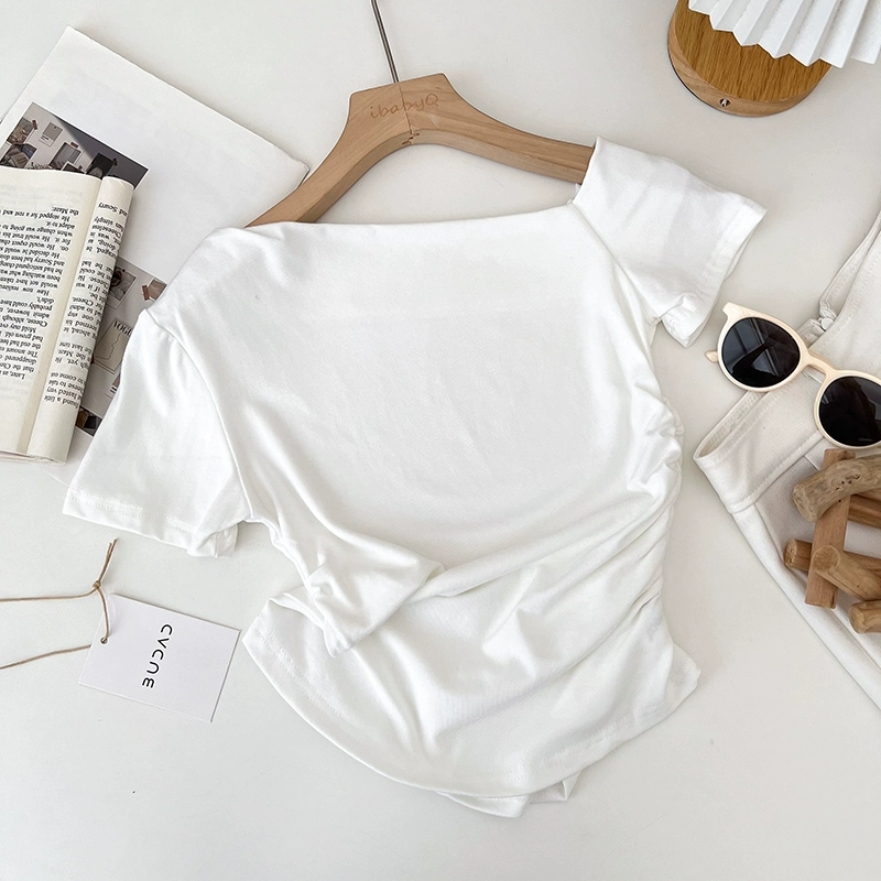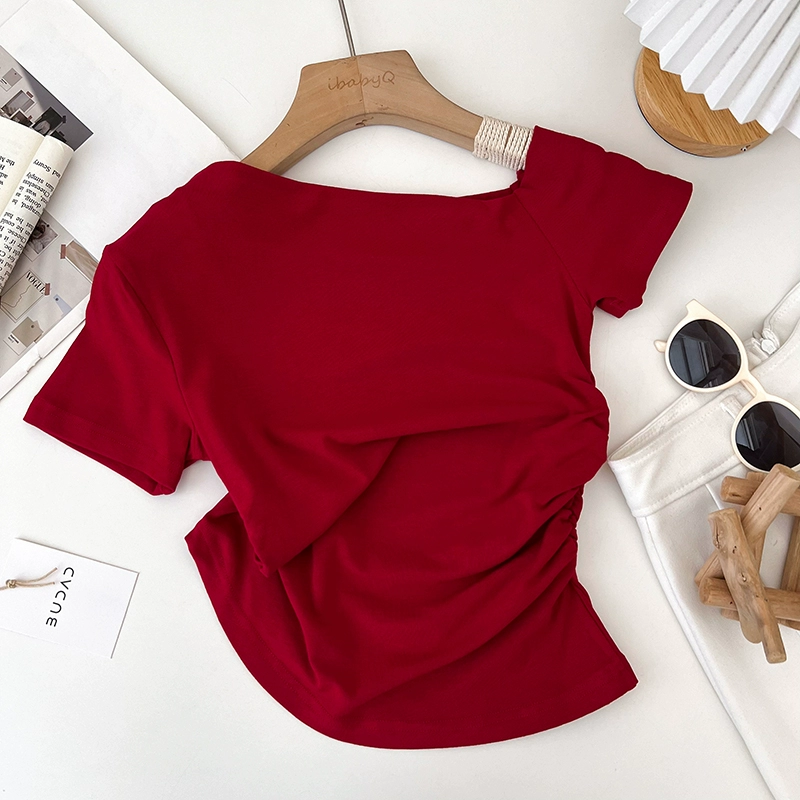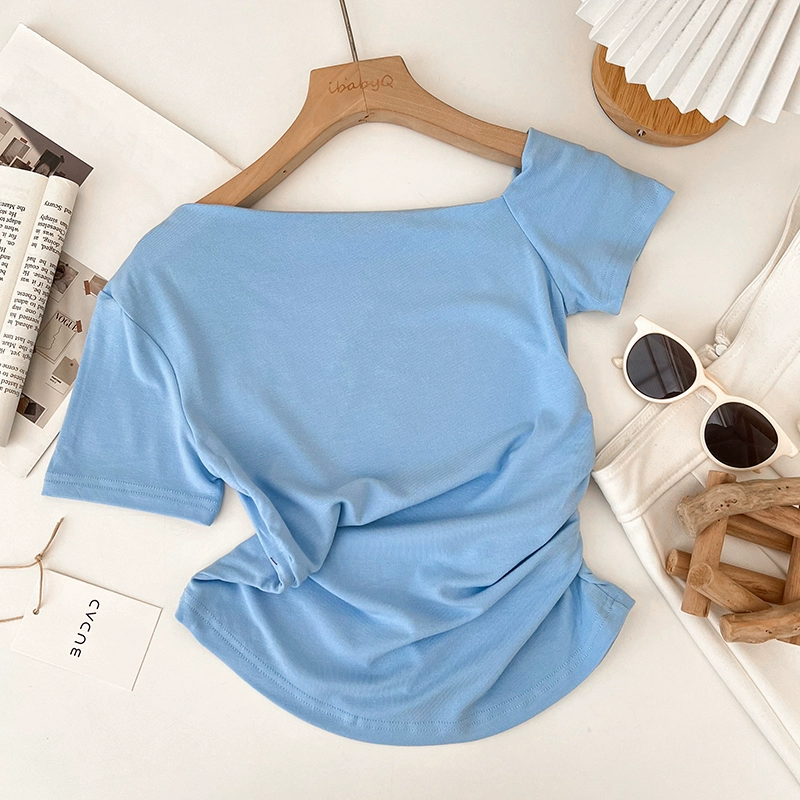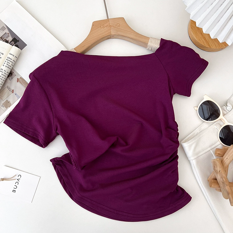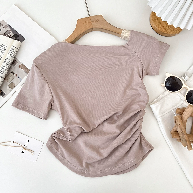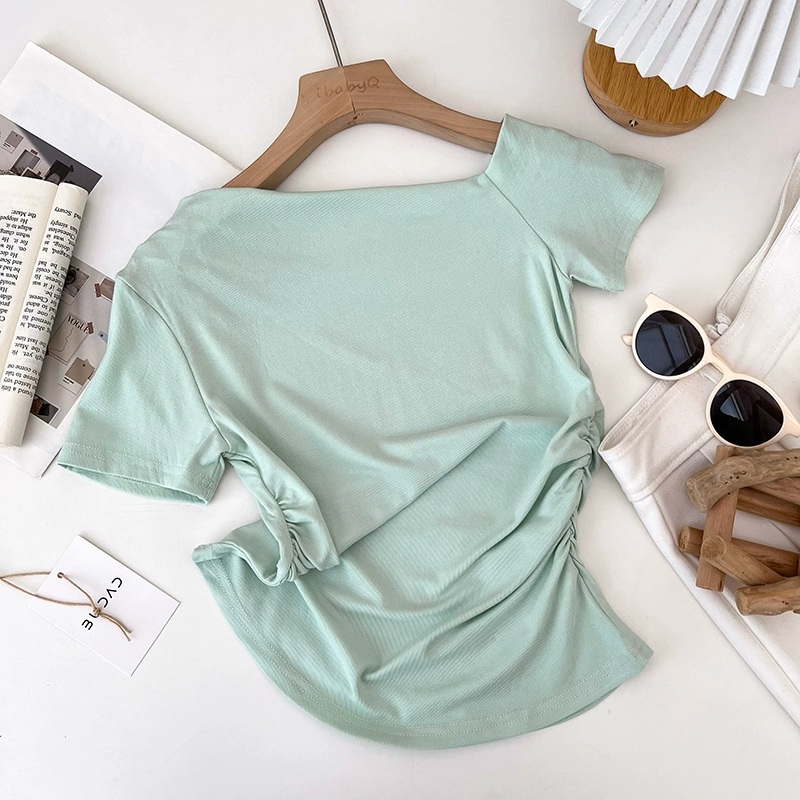 Off-shoulder design fashionable pleated slim-fitting top t-shirt
