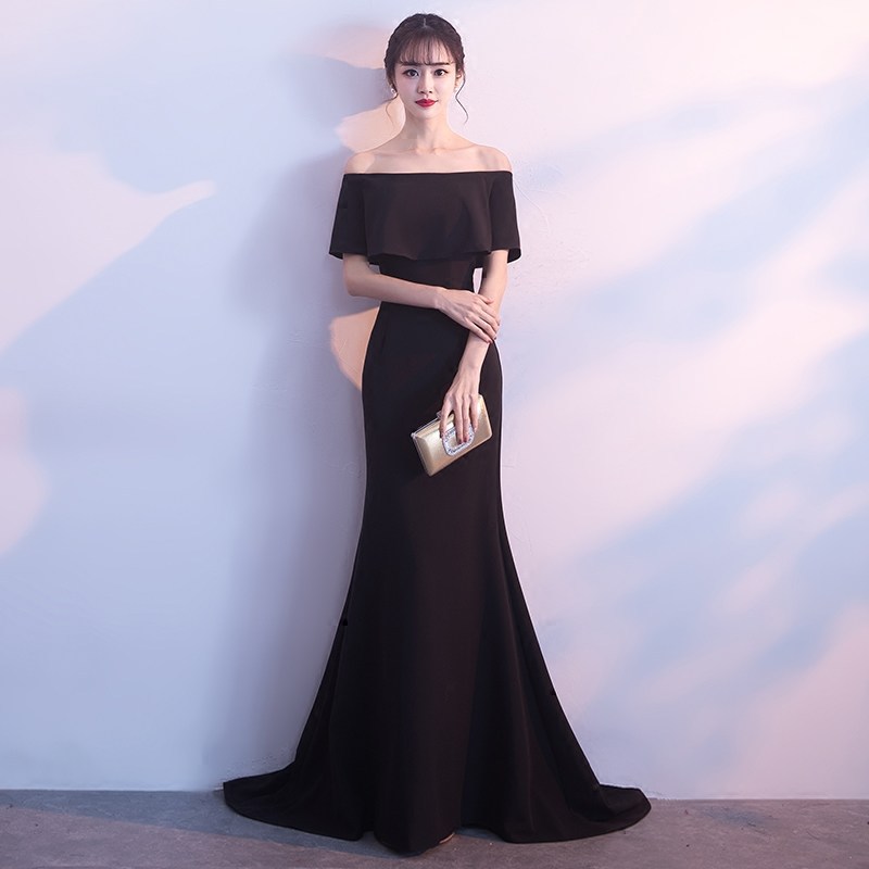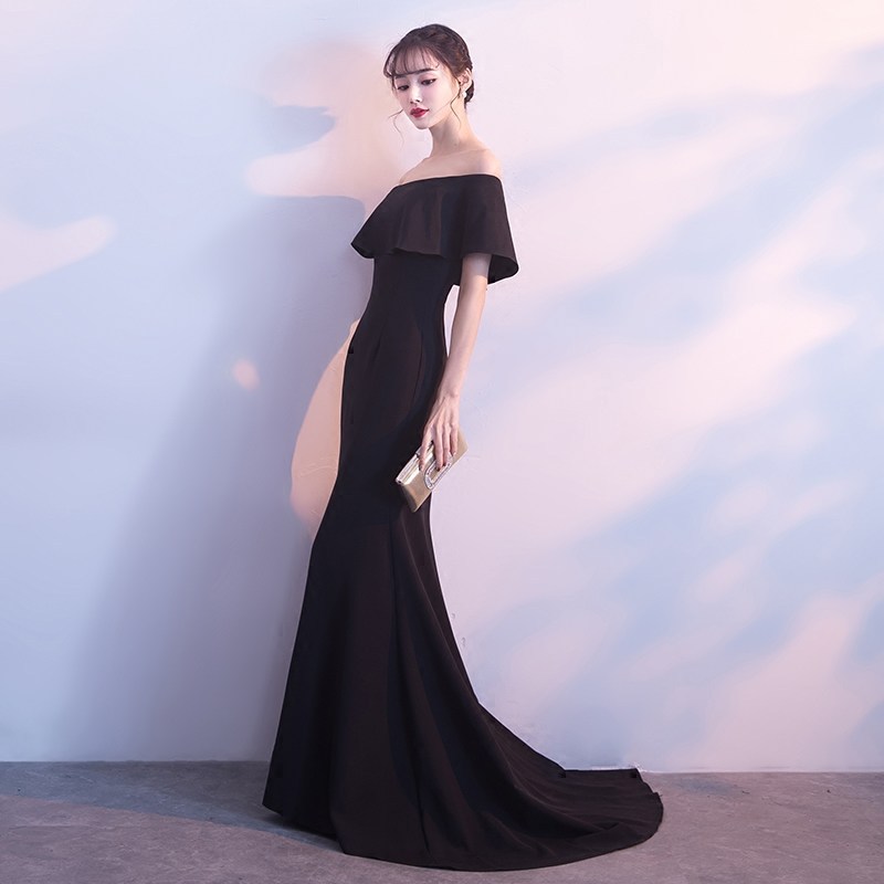 Off-shoulder Evening Dress for Women's 2023 New Style Celebrity Black Banquet Host Sexy Slim-fit Slimming Fishtail Long