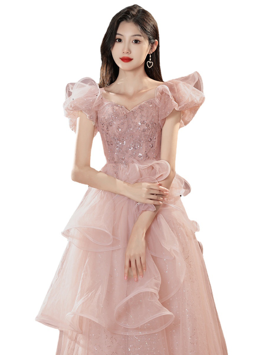 | nameOriginal | Off-shoulder French evening dress 2024 New elegant socialite host art exam Super Fairy pink engagement banquet dress |