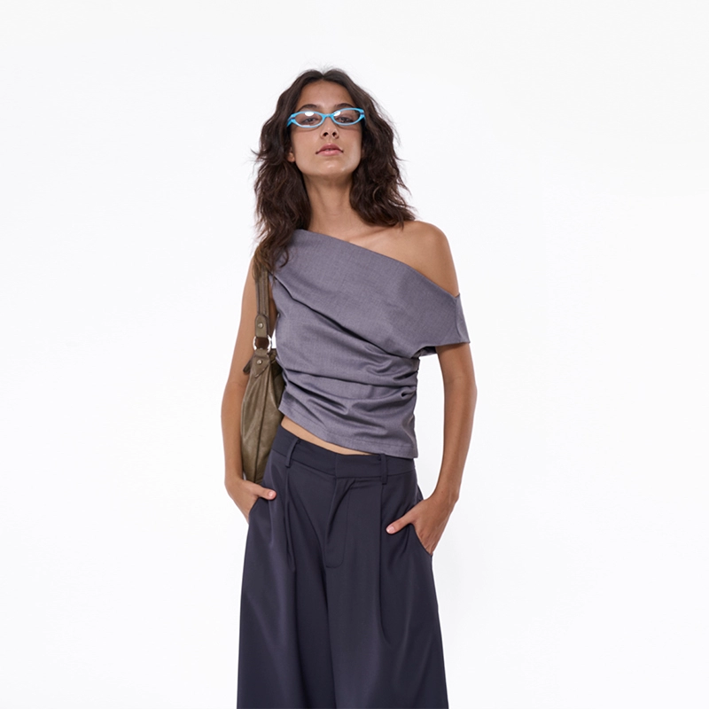 Off-shoulder INFO pleated asymmetric slimming versatile top