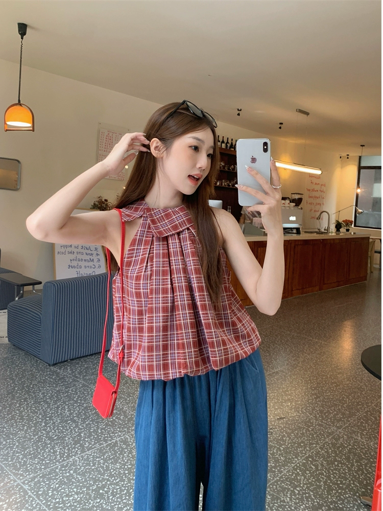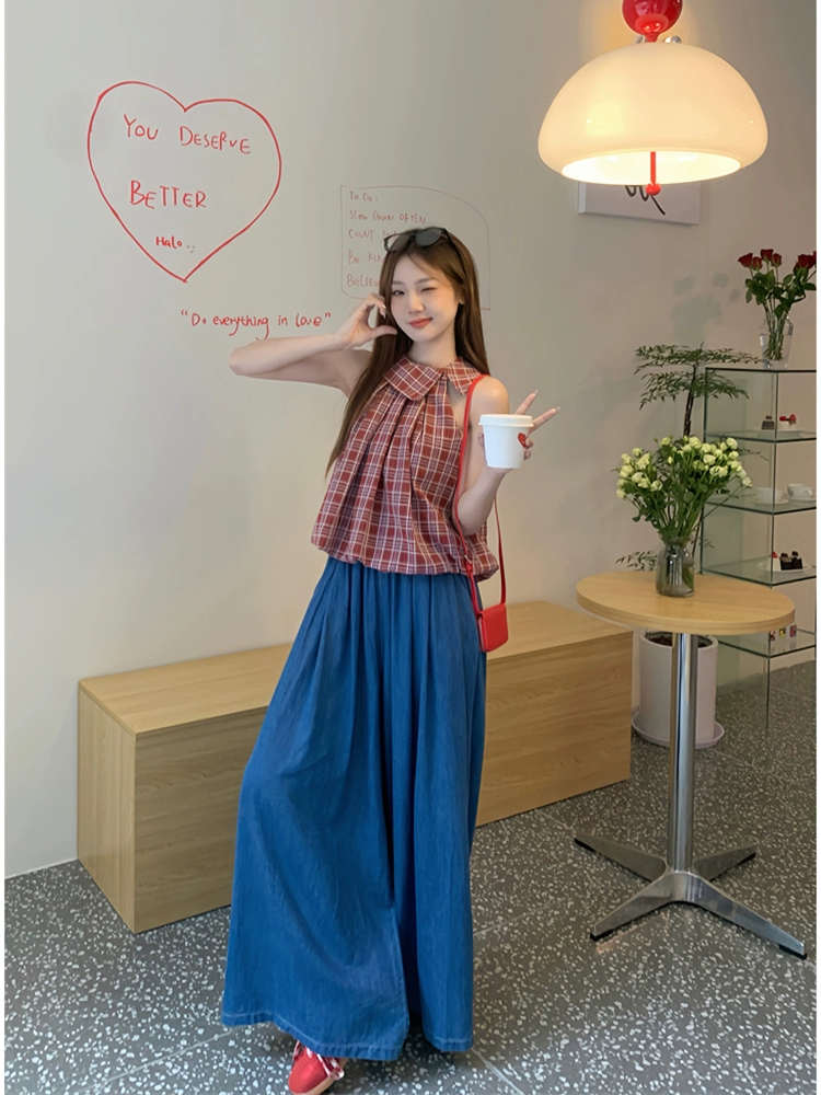 | nameOriginal | Off-shoulder irregular plaid casual trousers sleeveless shirt |