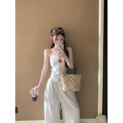 Off-shoulder kumikumi vest drawstring casual pants tube top
