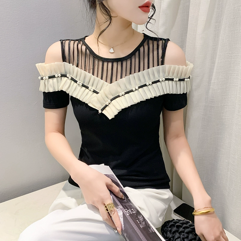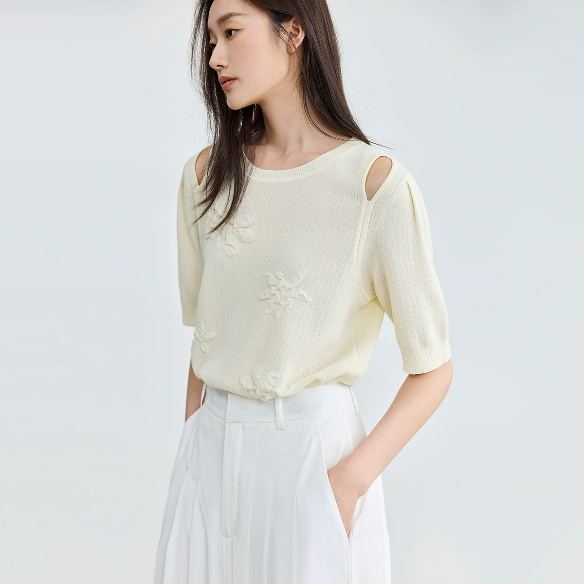 Off-shoulder LILY heavy industry three-dimensional floral top short sleeves