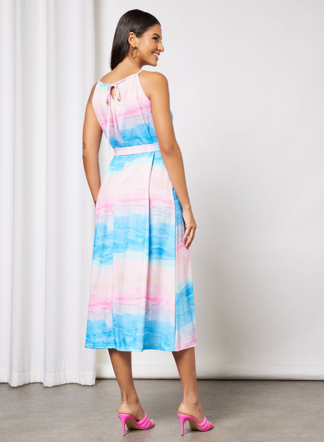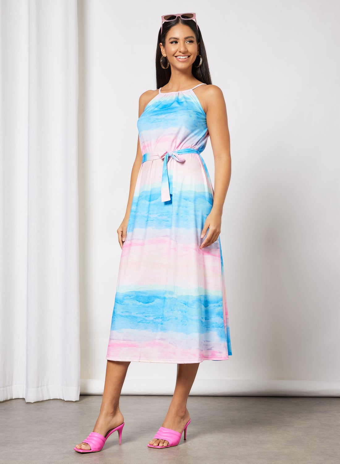 Off-shoulder Maxi Dress with Belt in Pink/Blue Tie-dye Pattern for Women.