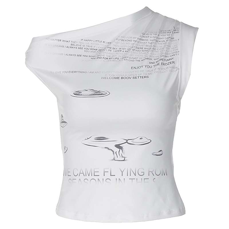 | nameOriginal | Off-shoulder niche letter irregular slant collar printed T-shirt |
