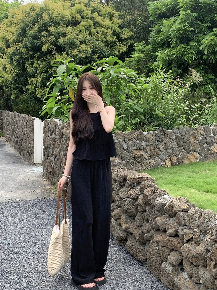 Off-shoulder patchwork elastic waist casual pants sleeveless shirt