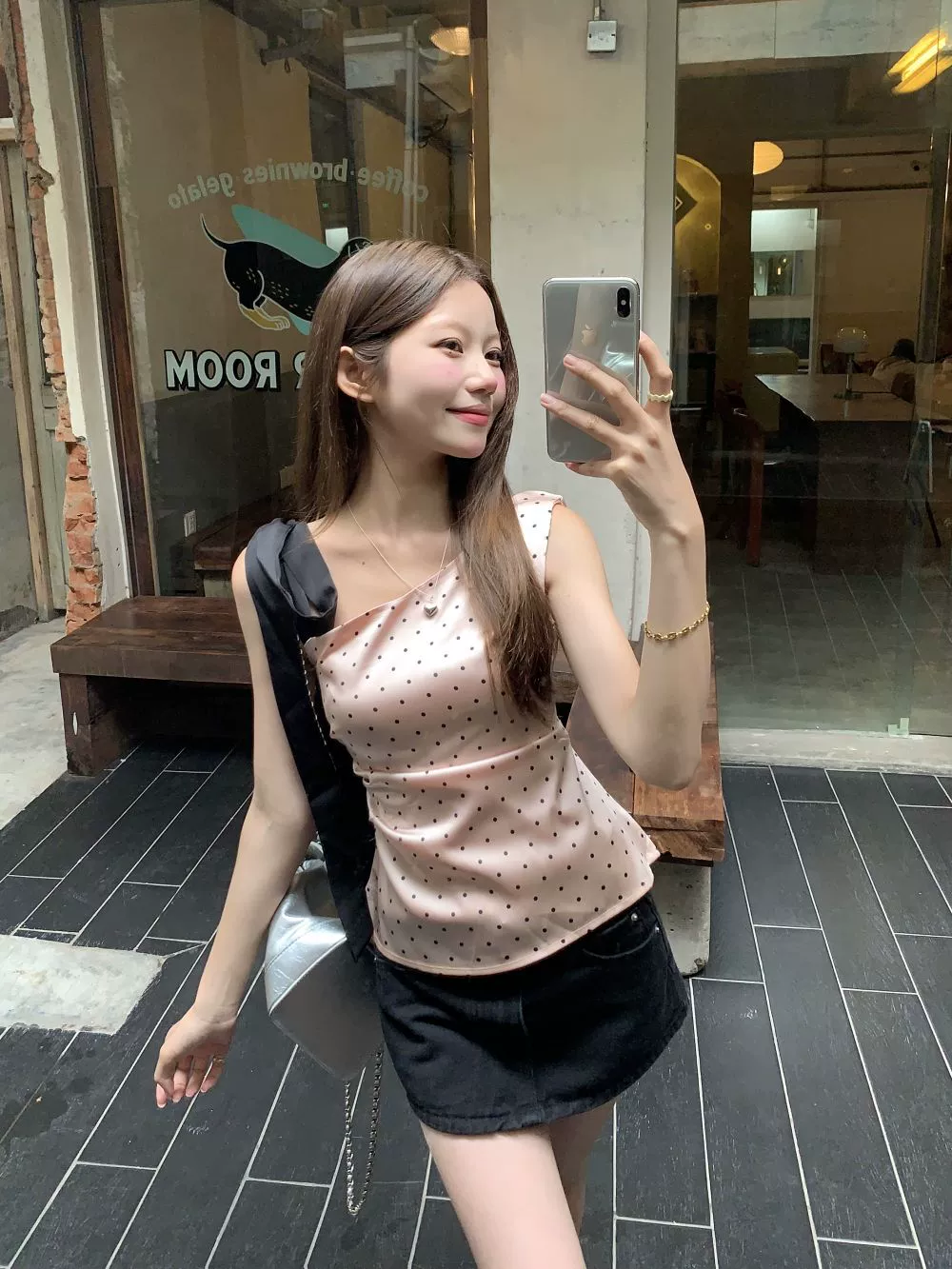 Off-shoulder polka-dot fashionable slimming pleated camisole
