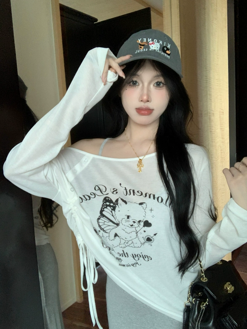 | nameOriginal | Off-shoulder white long-sleeved summer loose printed T-shirt |
