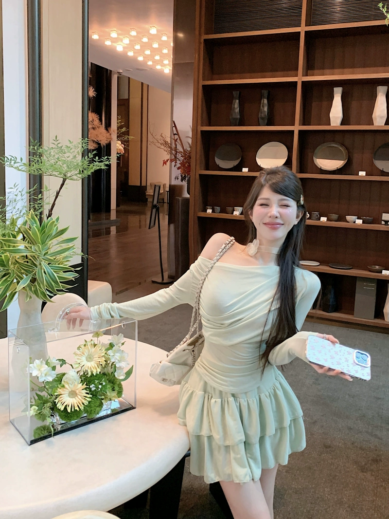 | nameOriginal | Off-the-shoulder cake short skirt two-piece long-sleeved T-shirt |
