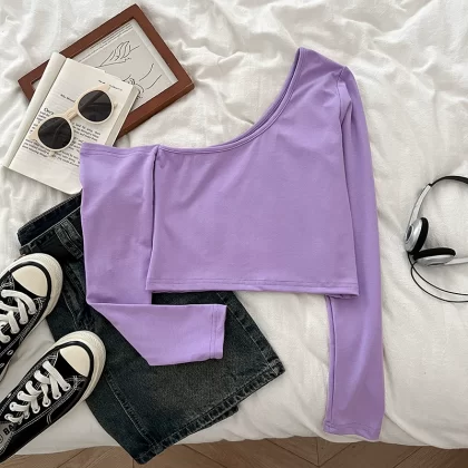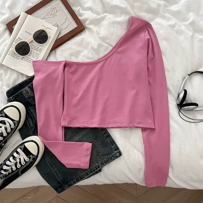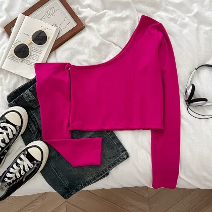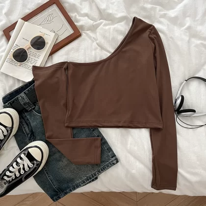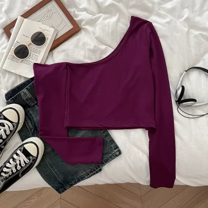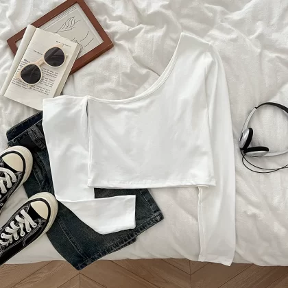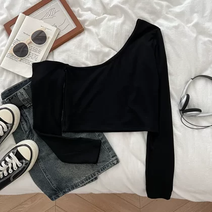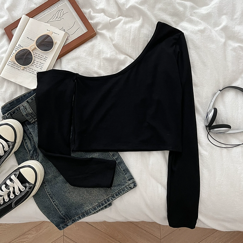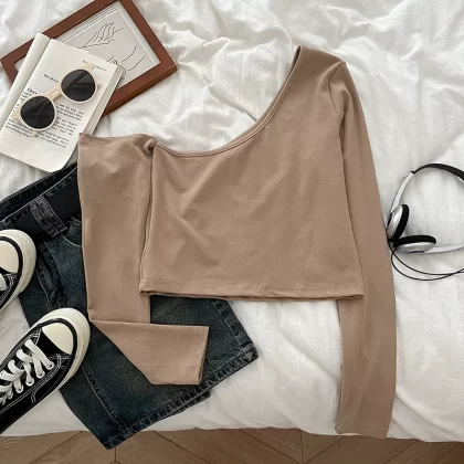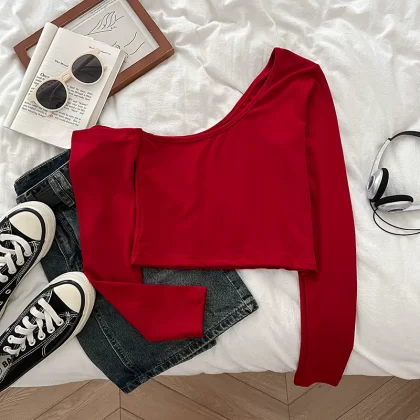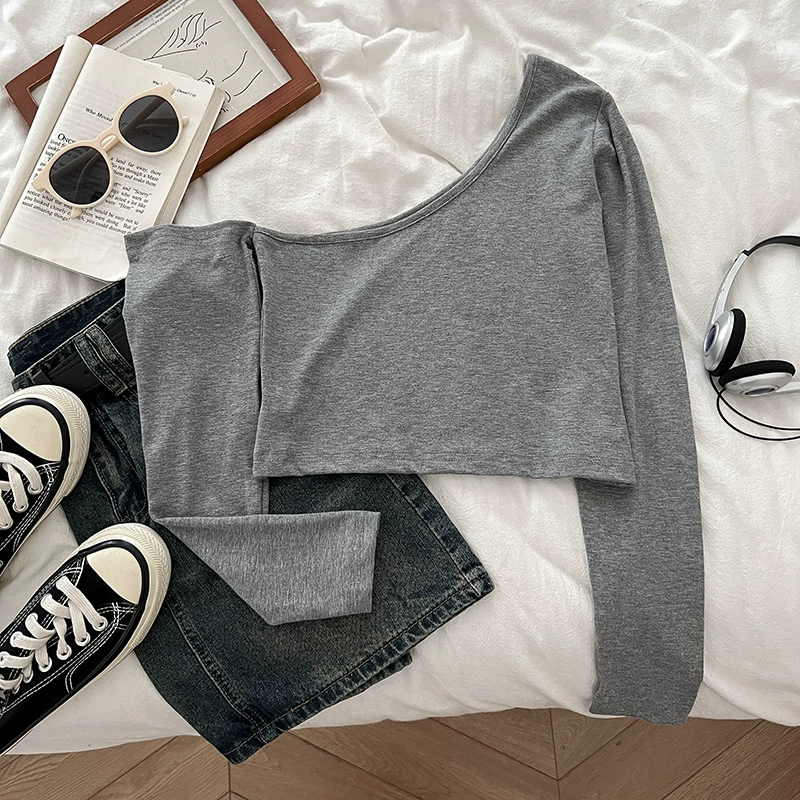 Oscar -shoulder fashion slimming, autumn and winter long -sleeved T -shirt