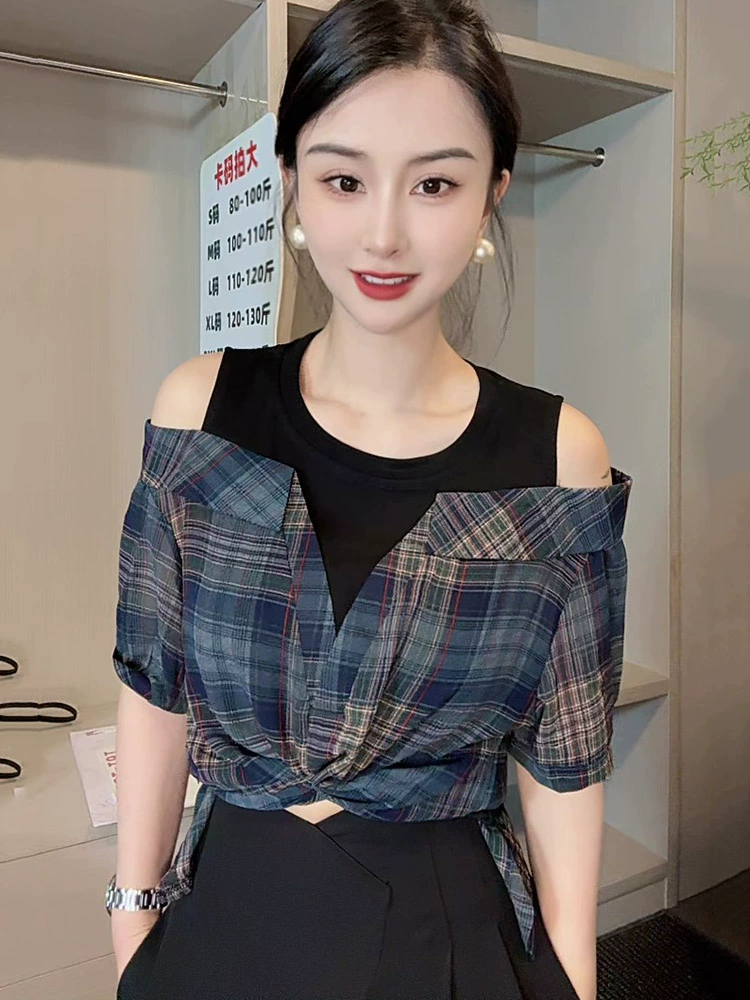 | nameOriginal | Off-the-shoulder patchwork plaid short-sleeves, chic and fake two-piece |