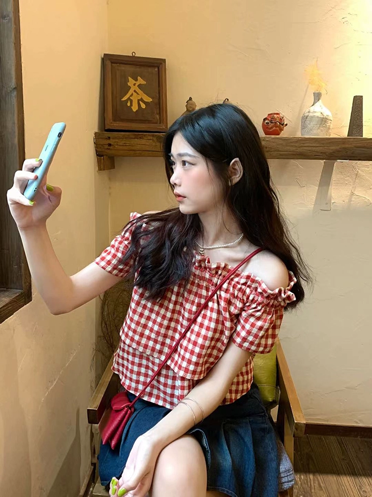 | nameOriginal | Off the shoulder retro red chic top plaid short sleeves |