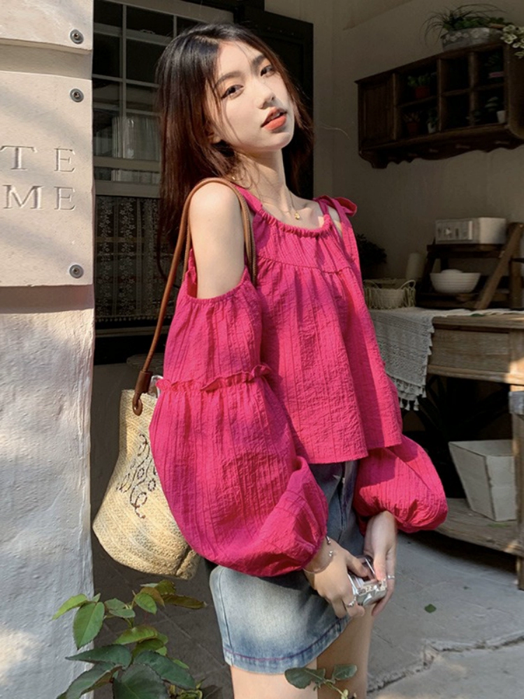 | nameOriginal | Off-the-shoulder rose red lantern short shirt top with suspenders |