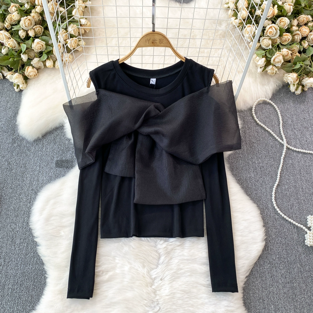 Off-the-shoulder spring and autumn bow-stitched casual mesh
