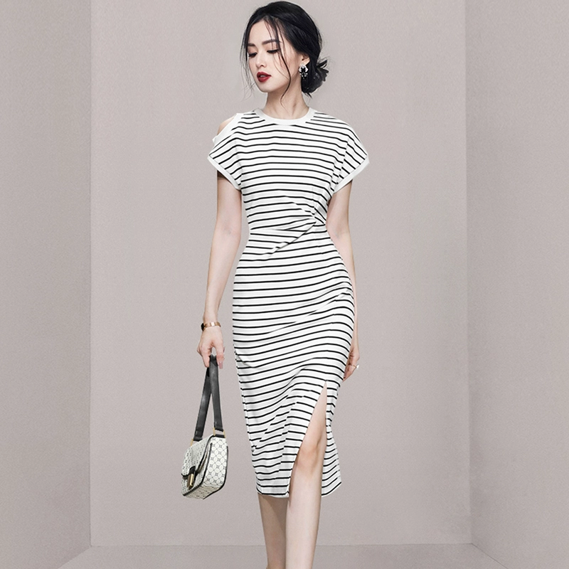 | nameOriginal | Off-the-shoulder striped slit cotton slim fit dress |