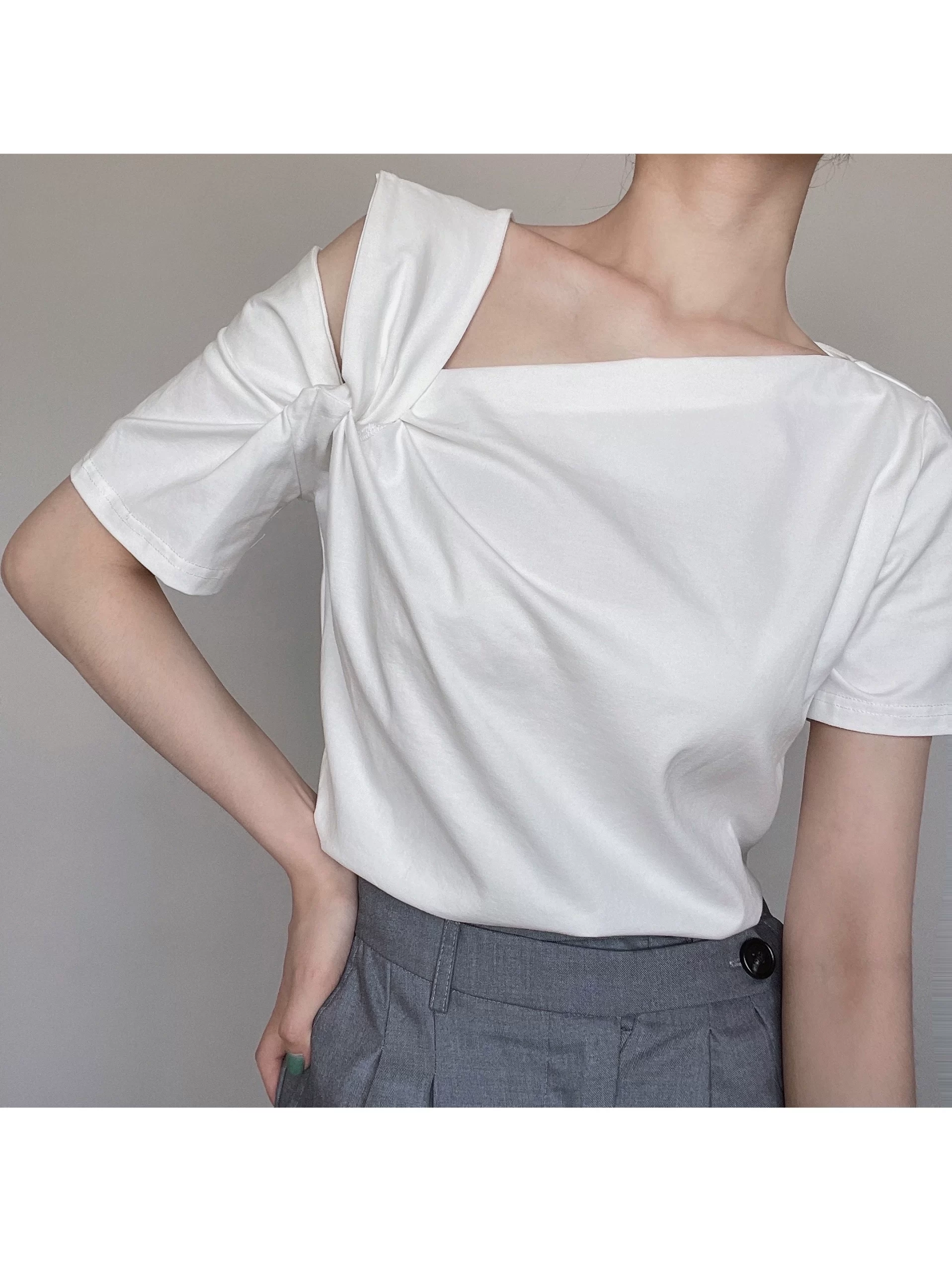 | nameOriginal | Off-the-shoulder summer one-sided slim-fit solid color short-sleeved T-shirt |