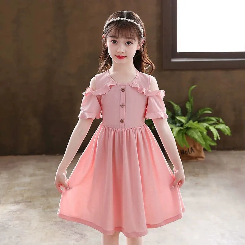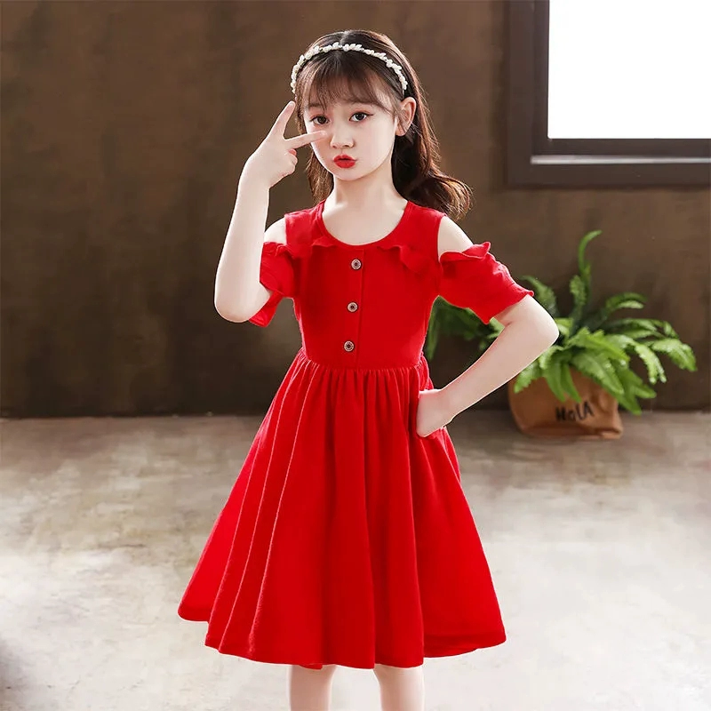 | nameOriginal | Off-the-shoulder summer style solid color dress for older children |