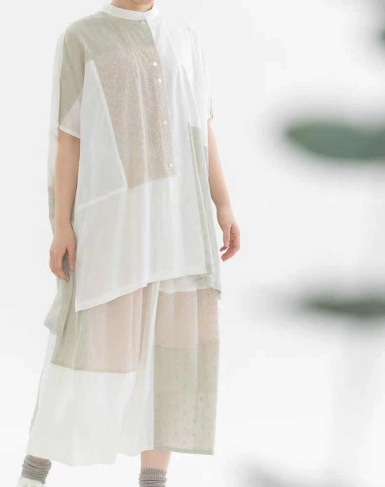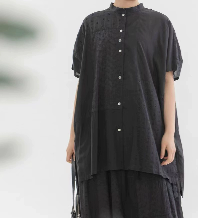 | nameOriginal | Official website flocking contrasting color splicing short-sleeved shirt women's 2024 summer new stand-up collar large size mid-length thin top |