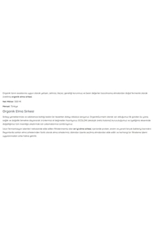 Organic apple cider vinegar produced as Natural Fermented from non-toxic, drug-free, genetically preserved and nutritional values intact apples grown in accordance with the principles of organic agriculture. Net Quantity: 500 Ml Origin: Turkey Organic Apple Cider Vinegar We love vinegar very much because of the sharp flavor it adds to our dishes and salads. Since the very first day of existence as organicgourmet, we prepare our products without touching the basis of health and naturalness. ECOLONI (ecological producer colony) on the axis of our founding and membership, we continue our work to bring our naturalness to all mankind. The best unfiltered apple cider vinegar obtained as a result of long fermentation processes contains proteins, enzymes and many useful bacteria in it. Our apple cider vinegars