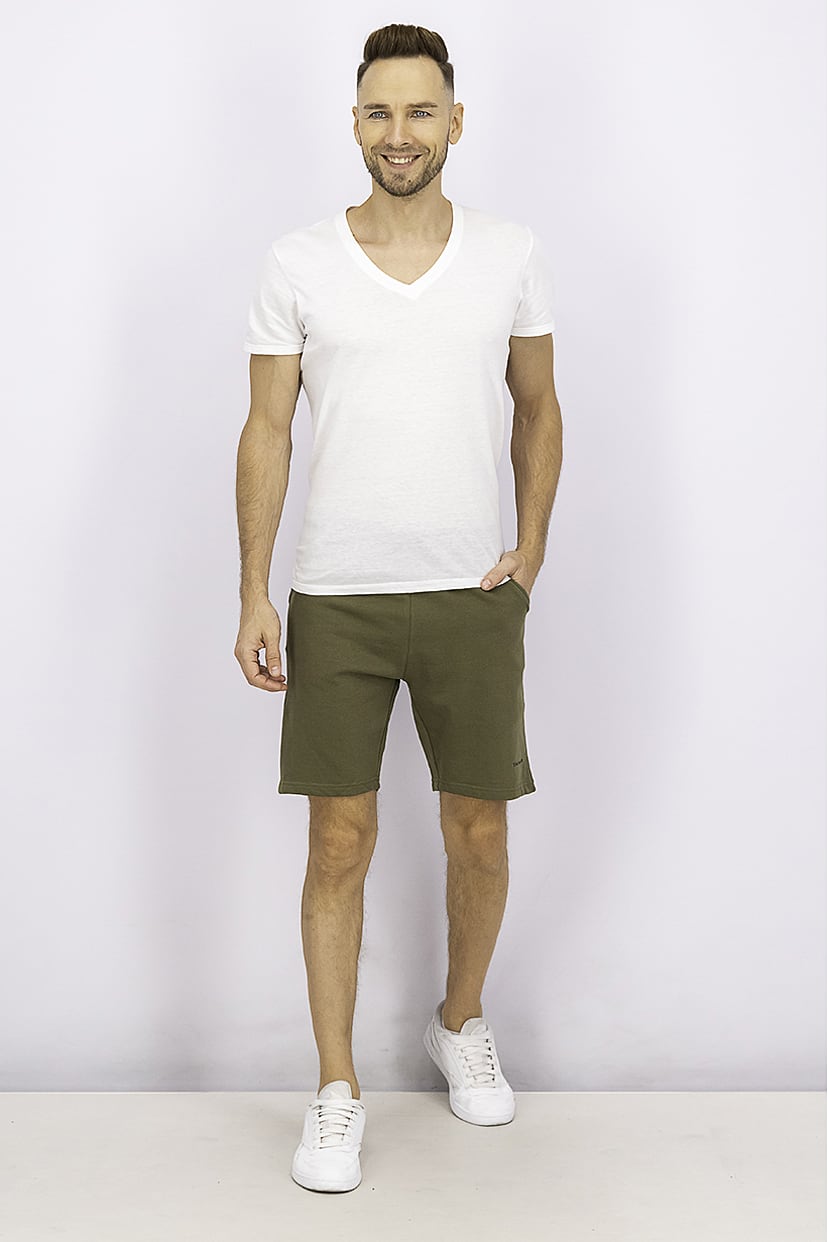 This product is easy to care for as it is machine washable. It has a regular fit and comes with two pockets. The size shown is in international sizing and it is made with stretchable fabric. This is a basic short with a drawstring closure at the bottom. The fabric is made of 65% cotton, making it suitable for casual occasions. The pattern and print is plain/solid and the color family is olive.
