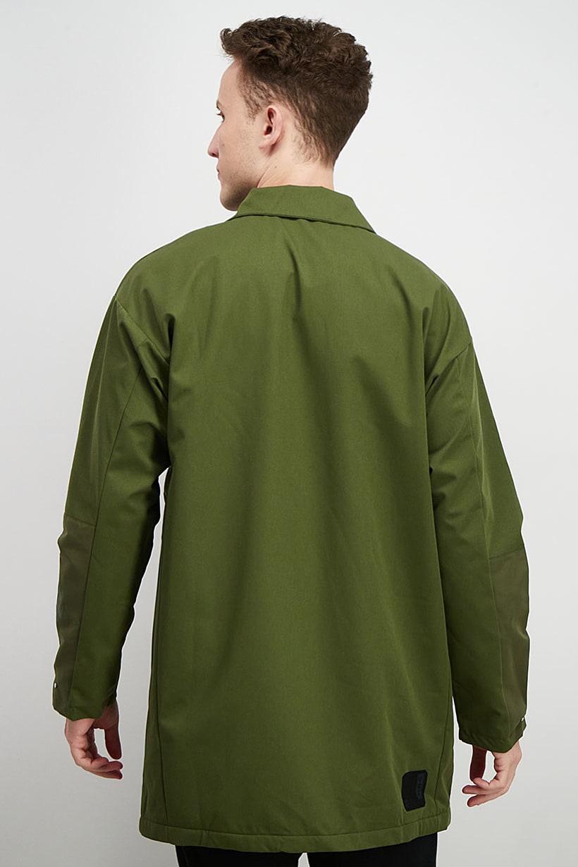 This jacket features a straight bottom hem and is designed for a sportswear fit. It is machine washable for easy care and made with light 100% cotton fabric. The jacket is suitable for outdoor sports and comes in a plain/solid olive color. The size shown is Asian and it falls under the sportswear type of jackets.