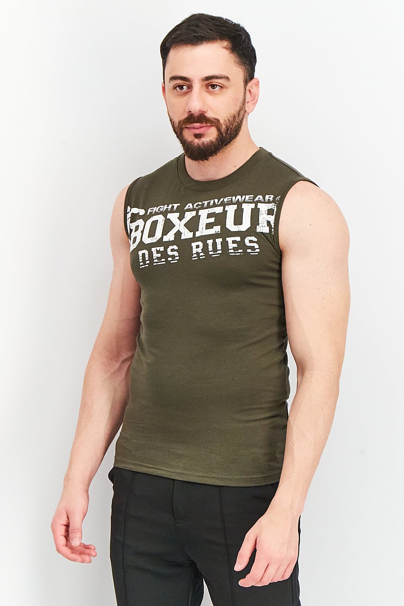 This product is easy to care for as it is machine washable. It has a regular fit and is available in international sizes. The fabric is made of 100% cotton and is light in thickness, making it suitable for training. Please note that the product color may appear slightly different due to lighting or monitor settings. The top features a brand logo print and is sleeveless, making it a great addition to your sportswear collection. The color family of this top is olive.