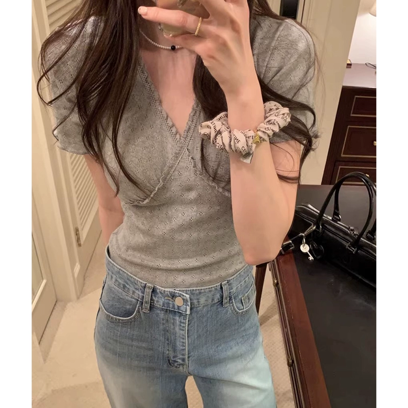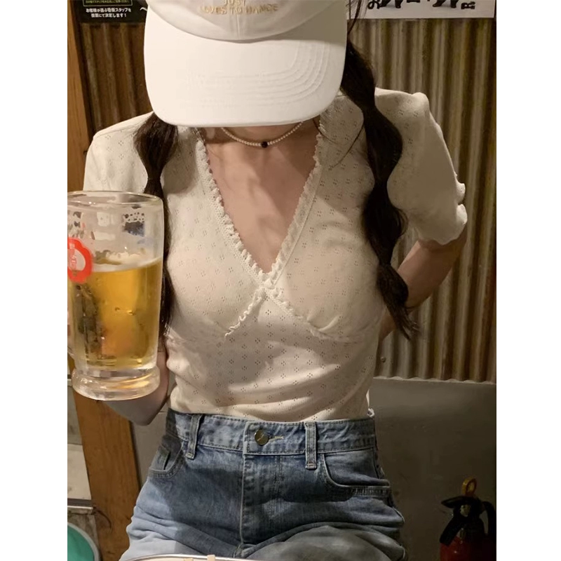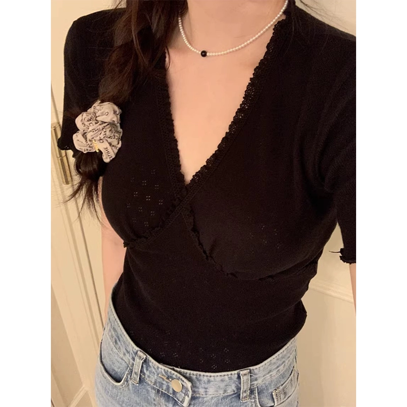 | nameOriginal | Omni ins niche stitching V-neck knitted short-sleeved lace |