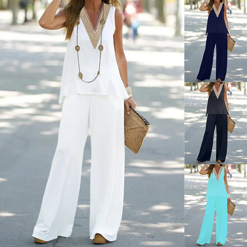 ON01220 2023 Autumn and Spring New Cross-border Women’s Fashion Casual Solid Color V-neck Sleeveless Loose Pants Two-piece Set