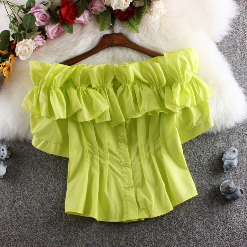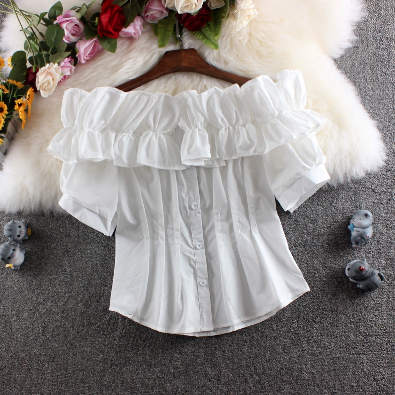 One word collar Korean version is thin, high waist pleated short -sleeved shirt