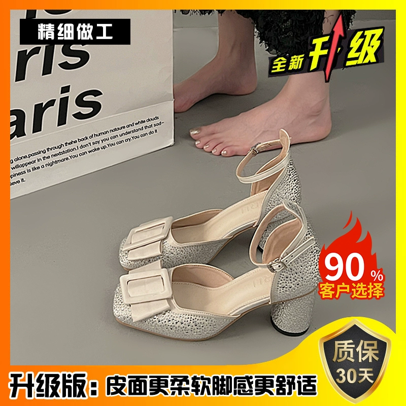 | nameOriginal | One-line thick heel hollow rhinestone square buckle toe-cap sandals |