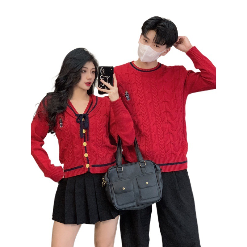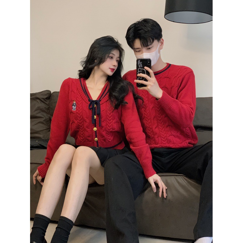 One-piece delivery 2023 real shot autumn and winter New Year navy neckline couple wear red sweater
