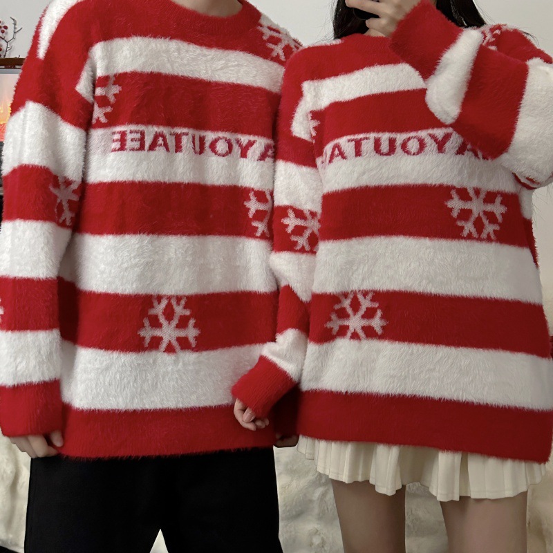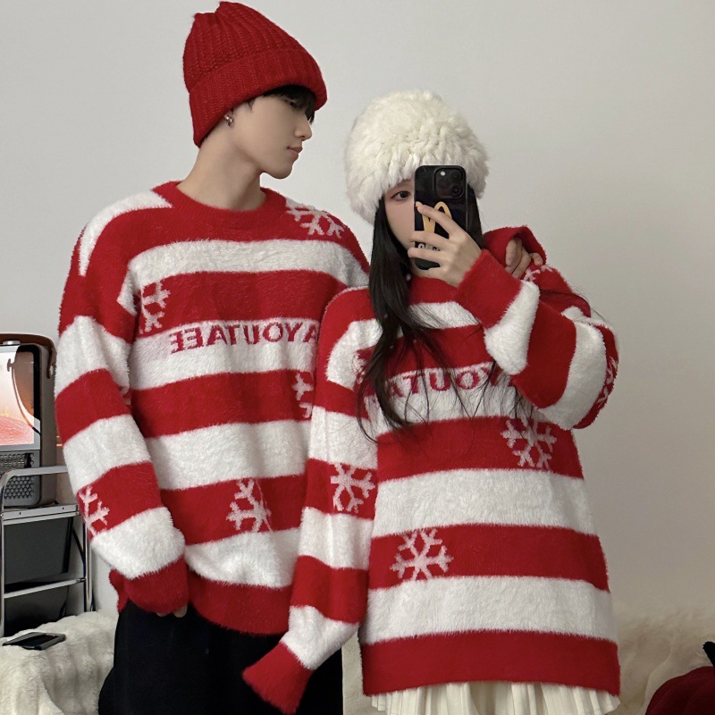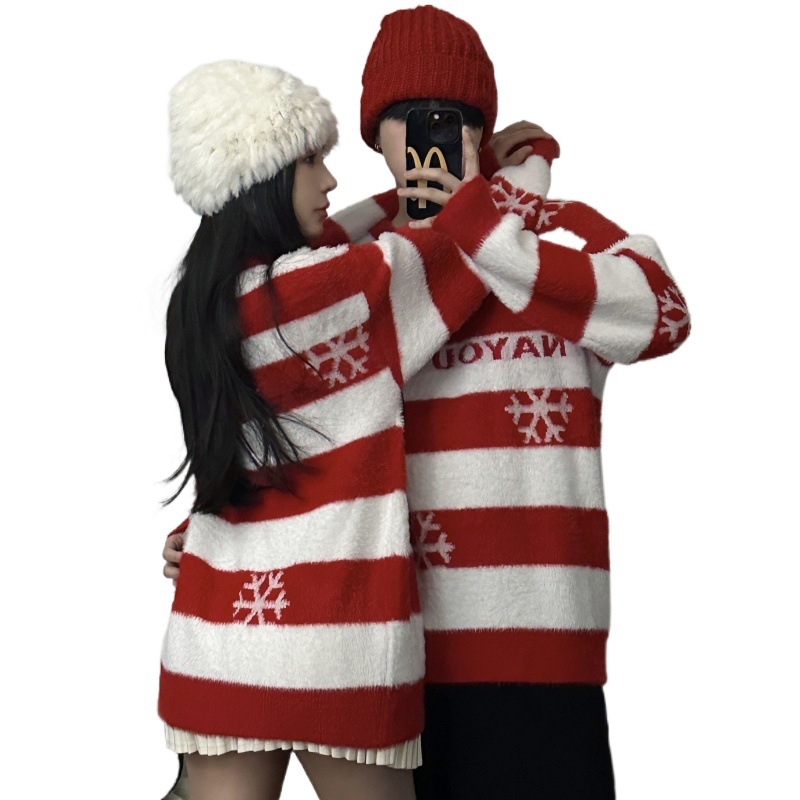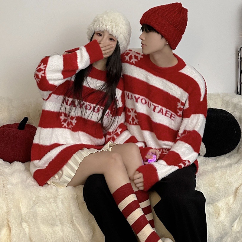 One-piece delivery 2023 real shot couple wear Christmas new autumn and winter atmosphere striped sweater retro loose lazy