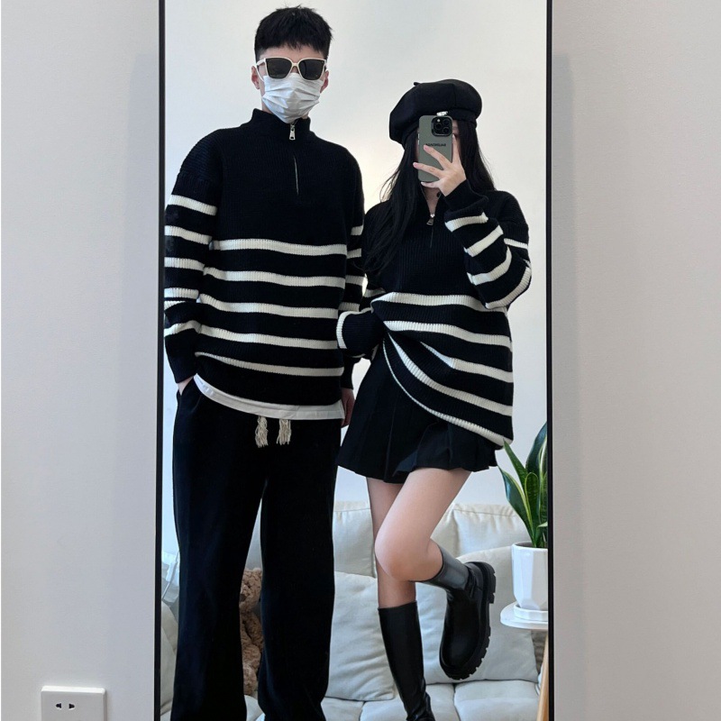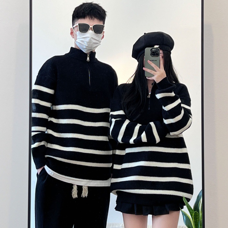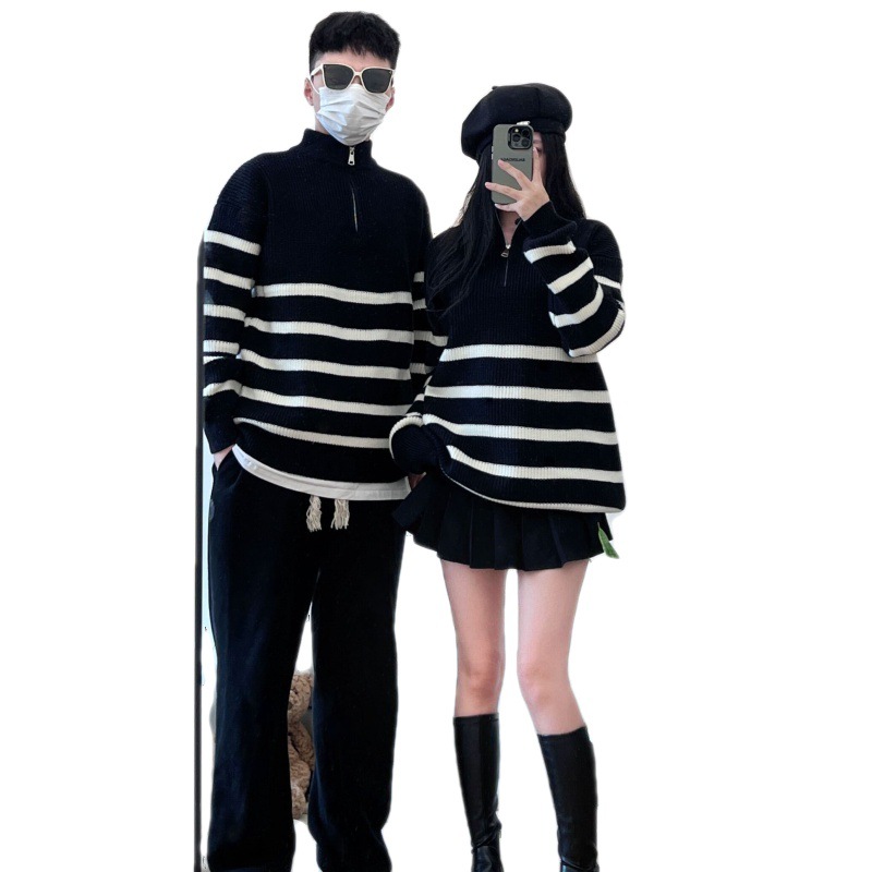 | nameOriginal | One-piece delivery 2023 real shot couple wear new year niche design casual retro black and white striped autumn and winter sweater |