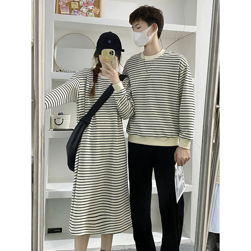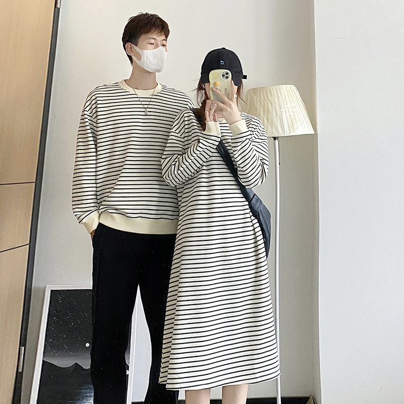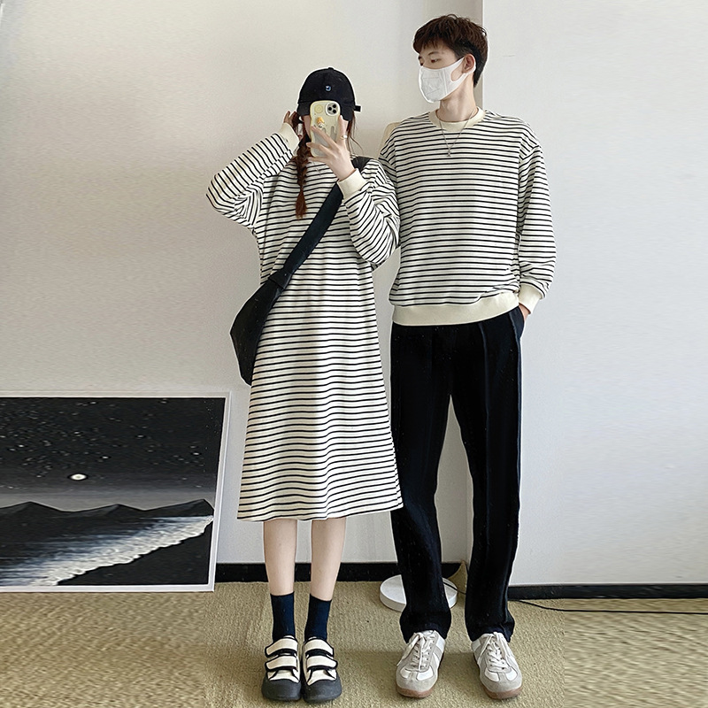 One-piece delivery 2023 real shot couple wear striped fashion simple striped sweater dress Men's Round Neck Pullover