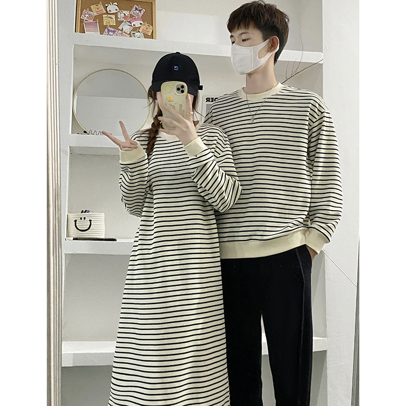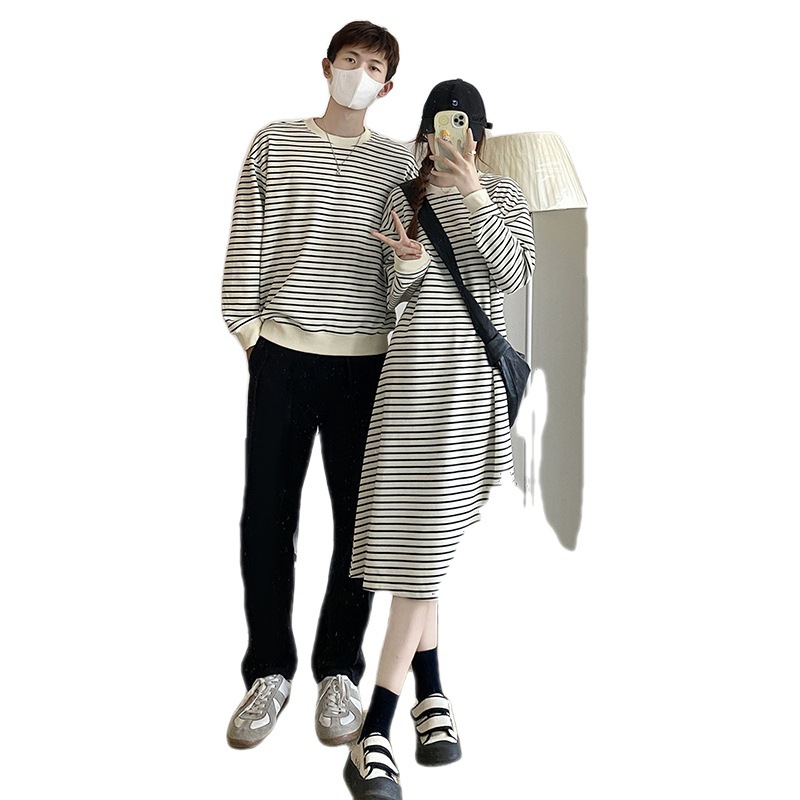 One-piece delivery 2023 real shot couple wear striped fashion simple striped sweater dress Men’s Round Neck Pullover