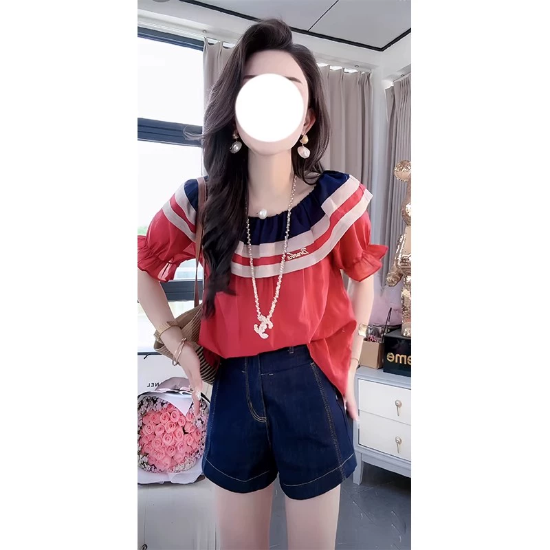 One-shoulder cotton and linen ruffled French short-sleeved shirt