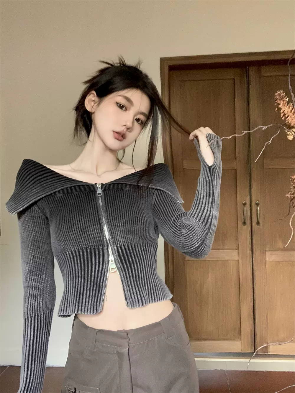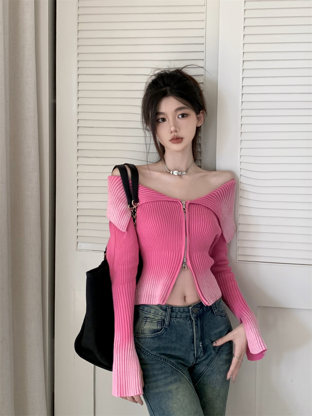 | nameOriginal | One-shoulder lapel hottie gradient zipper sweater |
