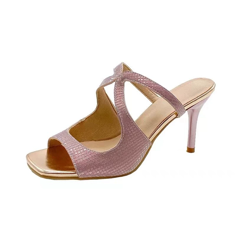 One word buckle square -headed sandals female 2024 Summer new net red fish mouth golden fine heel sexy high heels