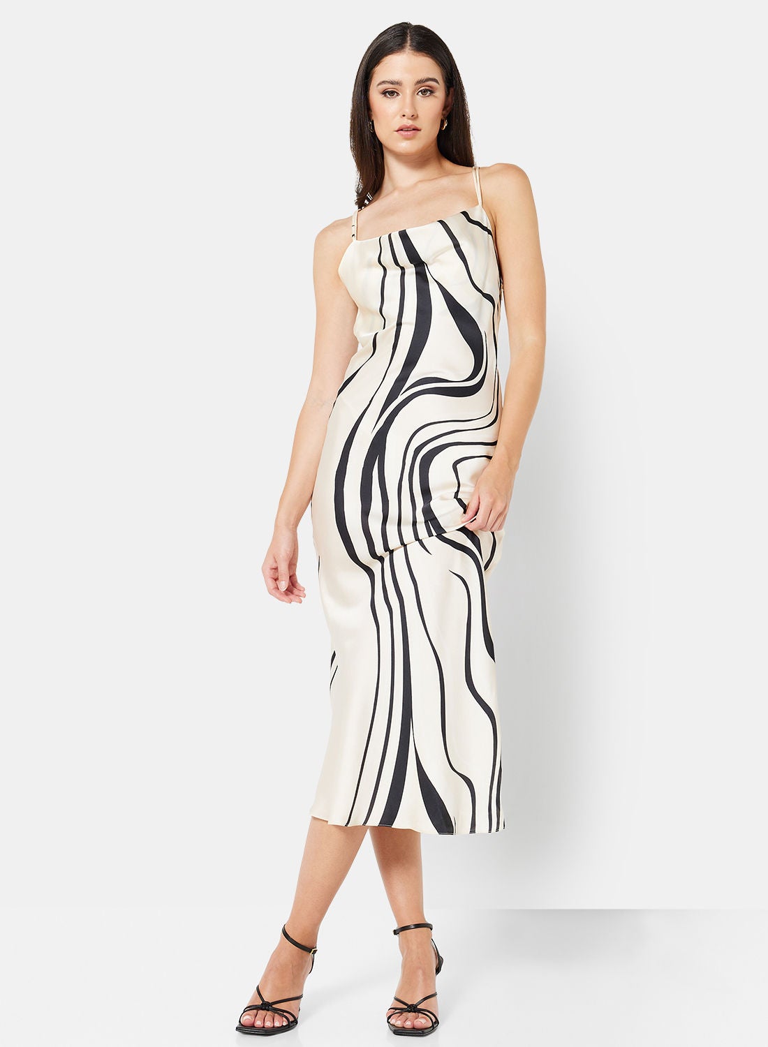 This product features a smooth and delicate polyester fabric with a satin finish. It showcases a striking abstract print throughout the garment. The cowl neck and slender shoulder straps add a touch of elegance, while the cross-over strappy back design adds a unique flair. The side zipper closure is concealed for a seamless look. The dress has a straight fit and falls to a midi length. Please follow the care label instructions when washing. The model is approximately 180 cm tall and is wearing a size S.
