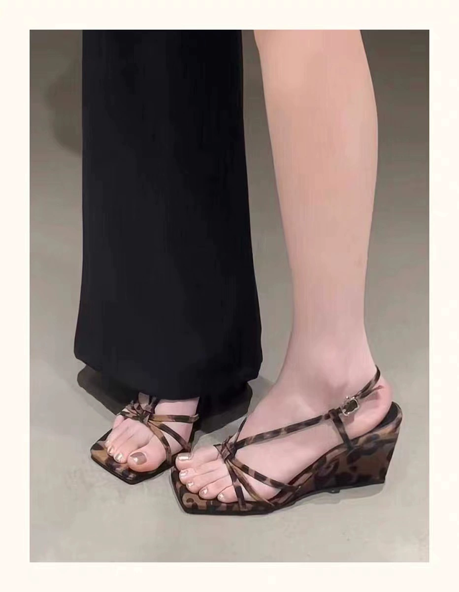 Open toe wedge heel French leopard print flip flops