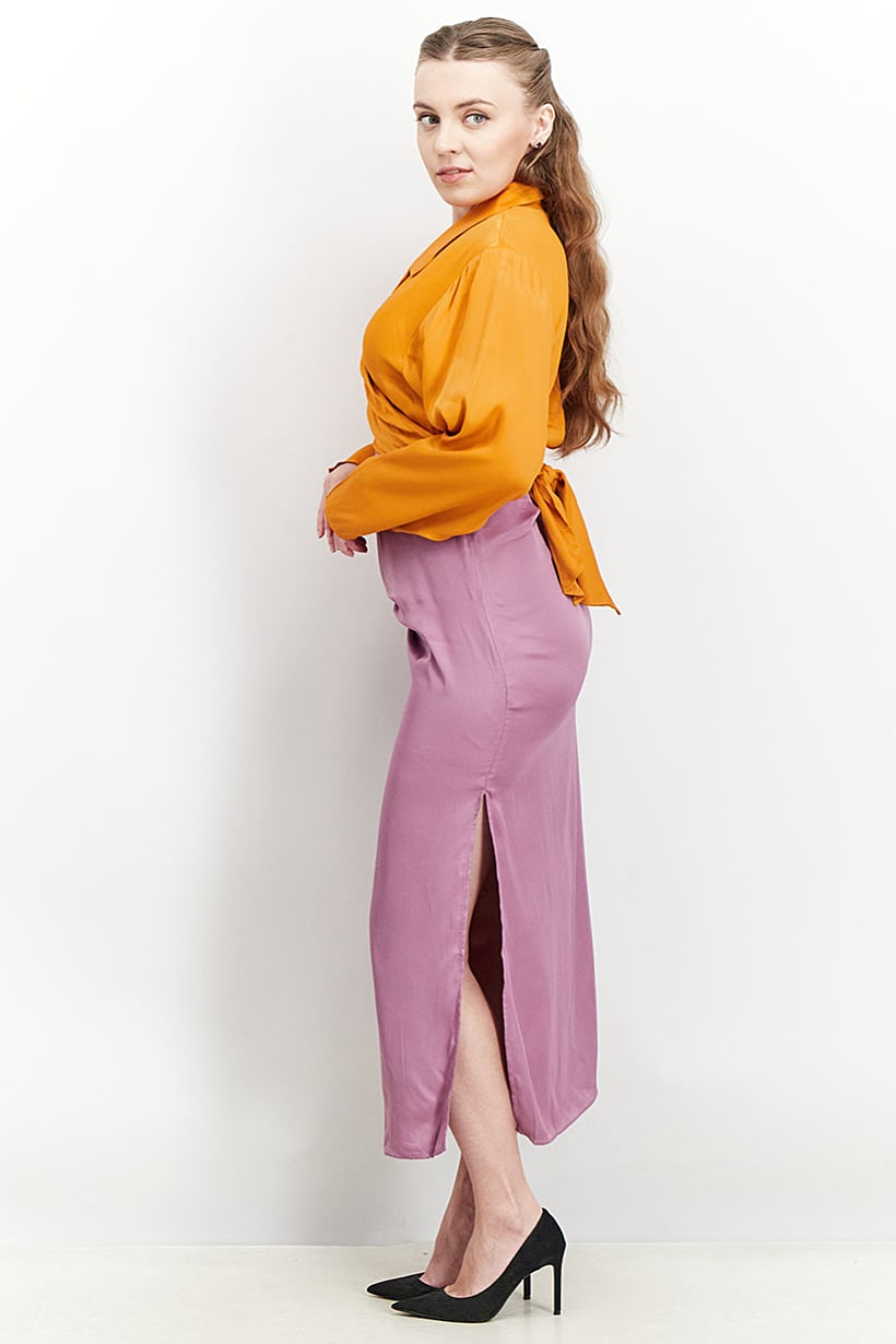 | sub_Categories | Women Clothing, Dresses, women notched collar long sleeve silky dress orange and purple |
