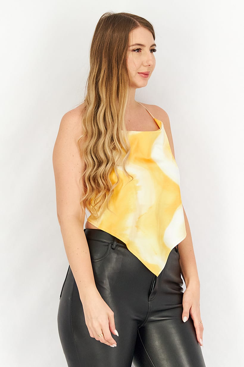 Care : Hand wash, Fit : Regular fit, Size shown : EU, Top Style : Cropped, Types of Hem : V hem, Types of Neckline & Collar : Round neckline, Types of Sleeve : Sleeveless, Fabrics : 97% Polyester, 3% Elastane, Occasion : Casual, Pattern & Print : Tie dye, Types of Closures : Pullover, Tie closure, Color Family : Orange,