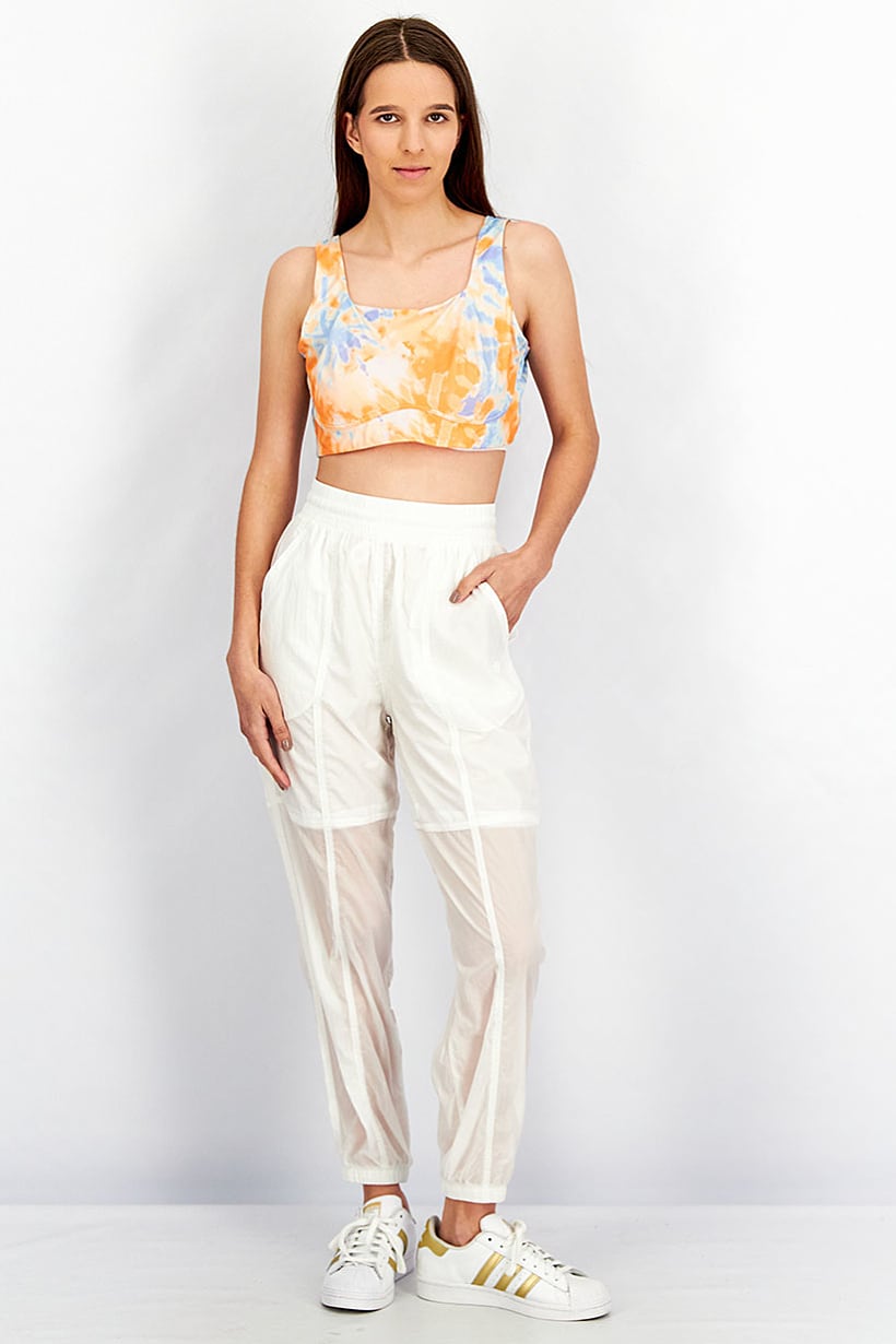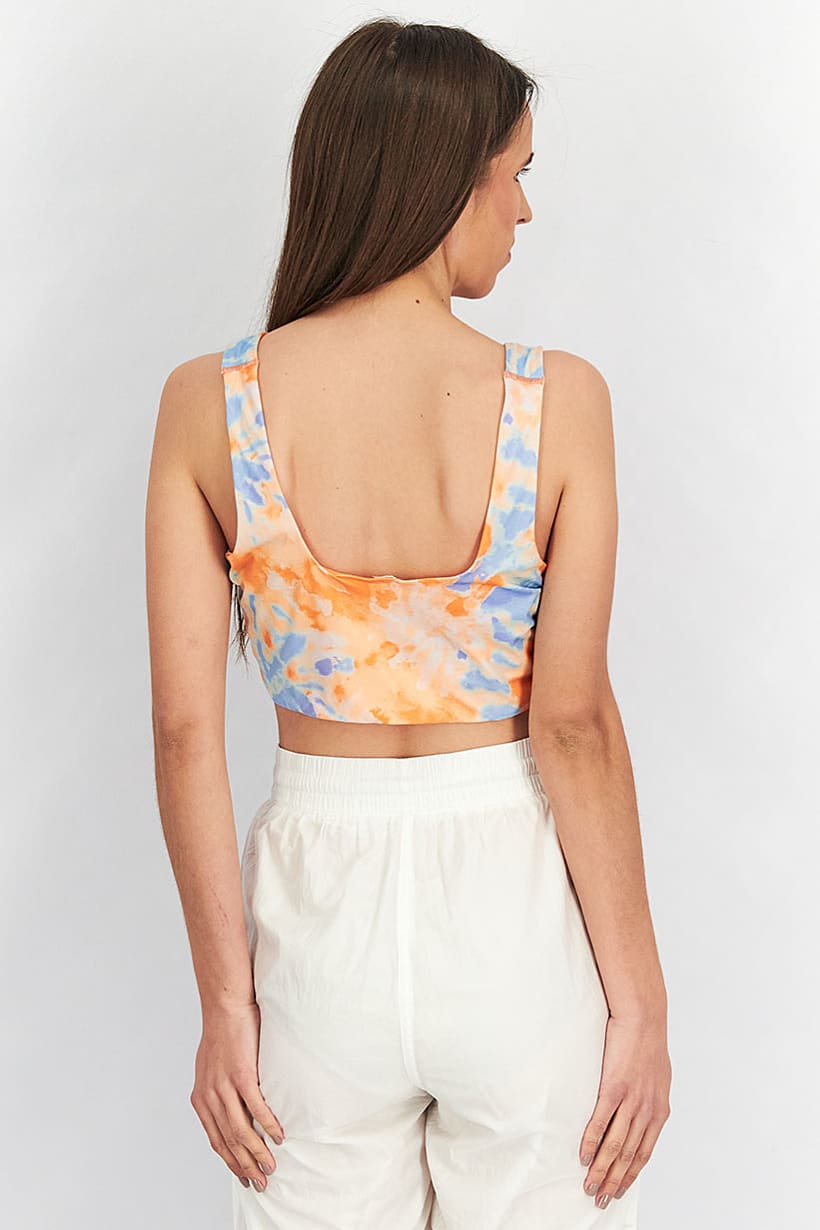 This sports bra is designed for women who are into training. It has a sportswear fit and a straight hem. The tie-dye pattern adds a stylish touch to the orange color. The bra is made of 85% polyamide and 15% elastane, making it machine washable. It has a pullover closure and is ideal for various sports activities. Please note that due to hygiene reasons, we do not accept returns on lingerie, socks, undergarments, and swimwear.