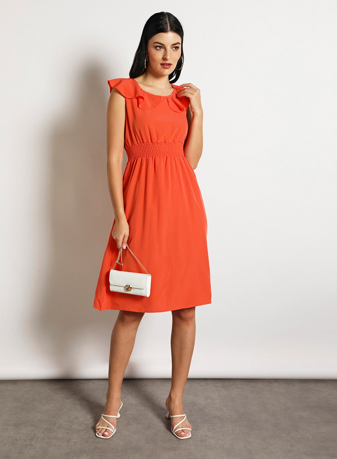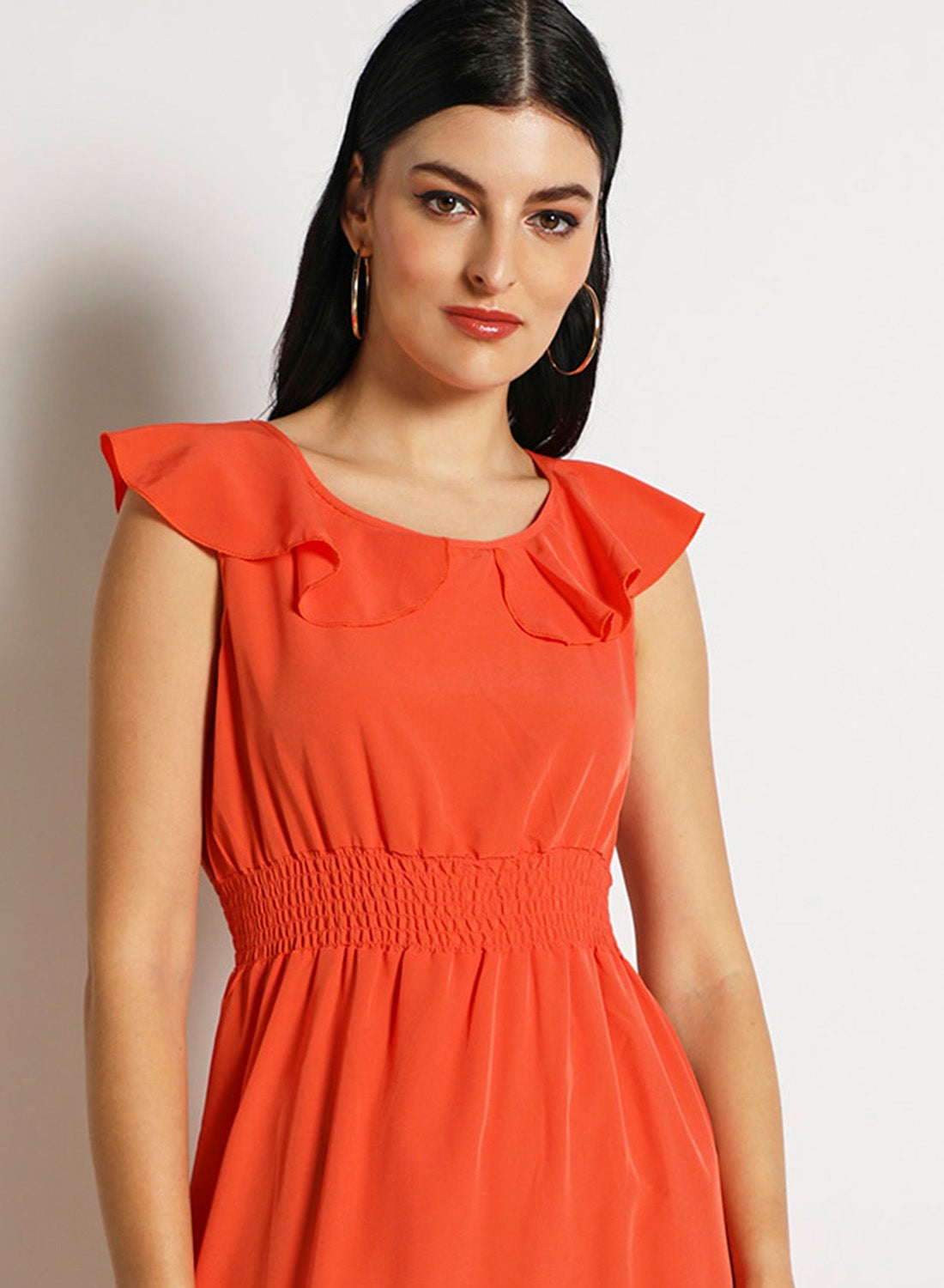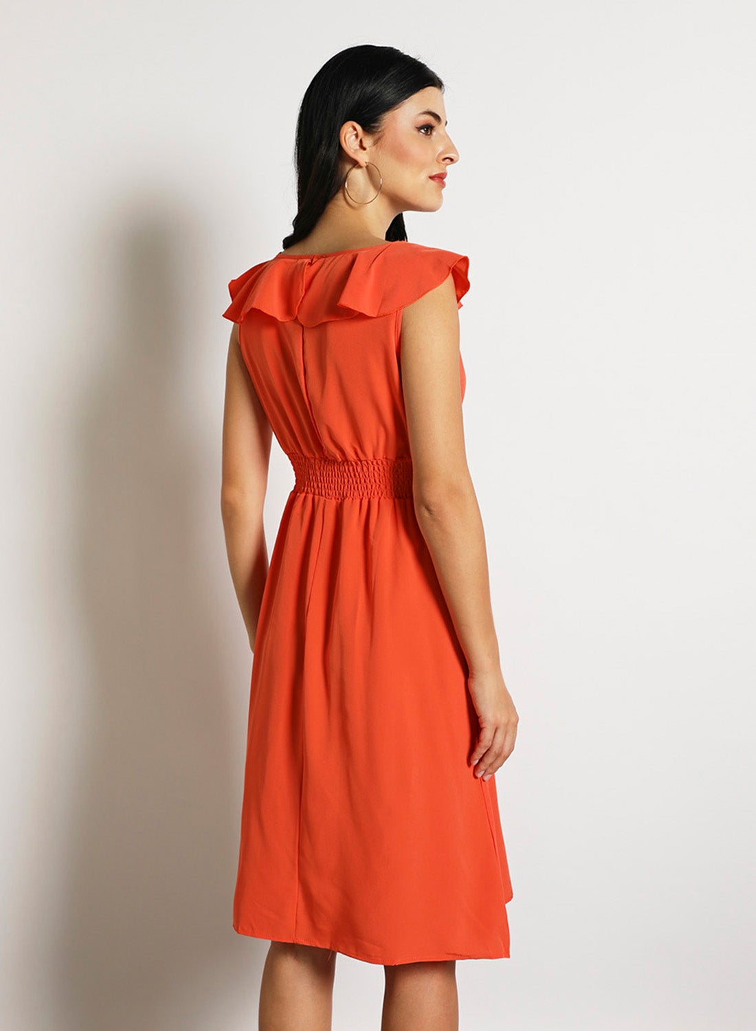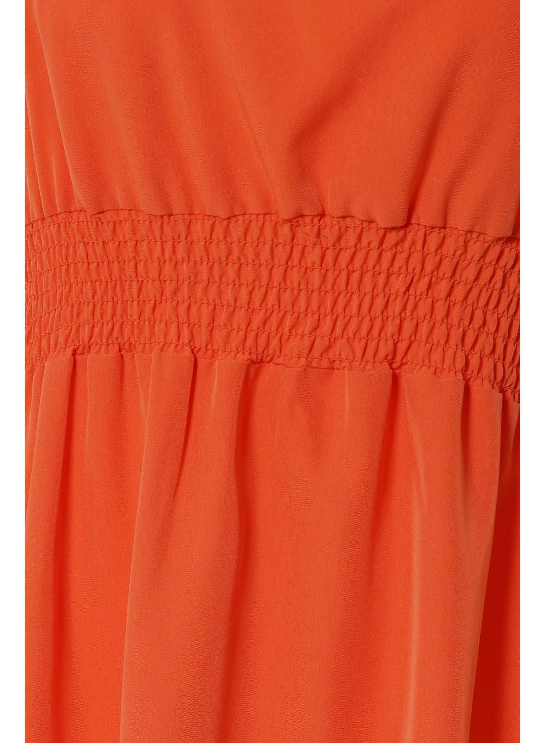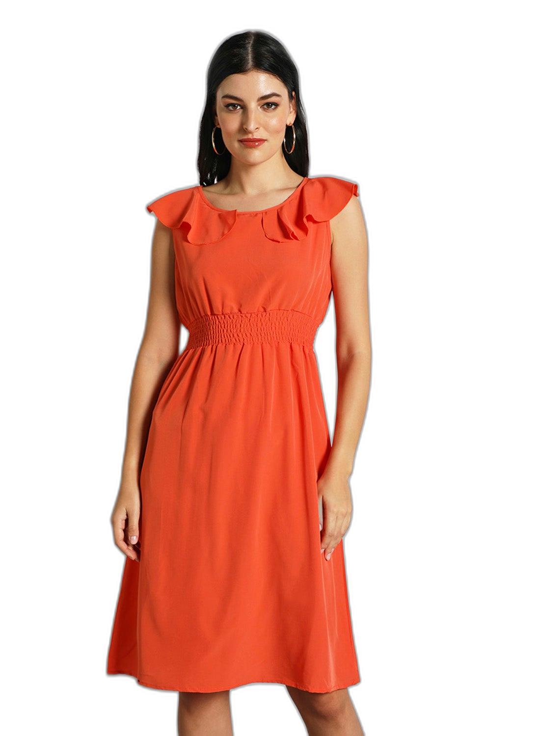 Orange Midi Dress with Puff Sleeves for Women’s Casual Wear.