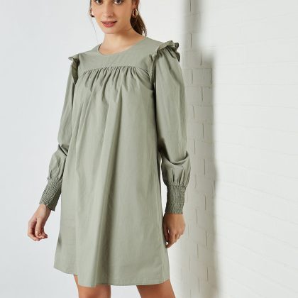 This dress is a timeless piece that you won’t want to miss out on. It features a round neckline, long sleeves, shirred cuffs, and a keyhole button closure at the back. Made from 100% organic cotton, it’s easy to care for by following the instructions on the care label. The model in the photo is 174cm tall and is wearing a size S.