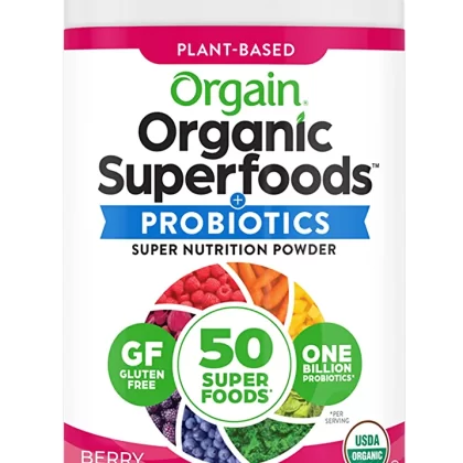 The Orgain organic superfoods powder contains a blend of 50 organic superfoods in each scoop. It is a healthy combination of organic greens, vegetables, fruits, and sprouts that can be easily mixed with water, juice, or smoothie for a nutritious boost.